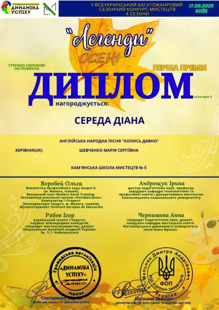Ученица Каменской школы искусств №5 Диана Середа завоевала первую премию на II Всеукраинском многожанровом сезонном...