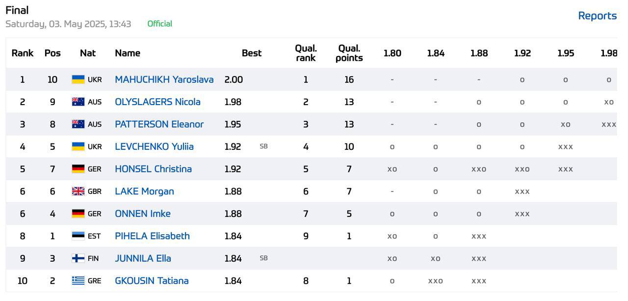 Позади остались австралийки: Никола Олислагерс с результатом 1,98 м и Элеанор Паттерсон, которая взяла 1,95 м. Ещё одна украинка, Юлия Левченко, заняла четвёртое место с личным рекордом сезона — 1,92 м.