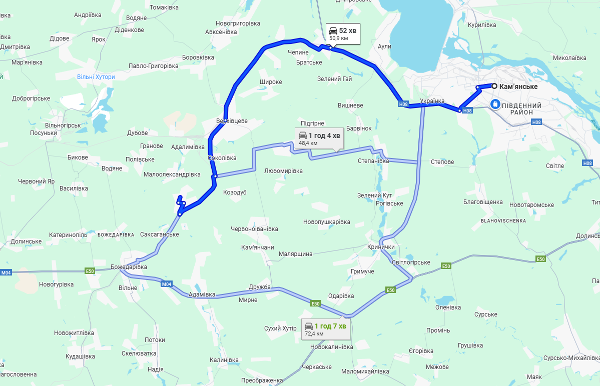 Выезжайте с Каменской трассой Н08 в направлении Верхнеднепровска.