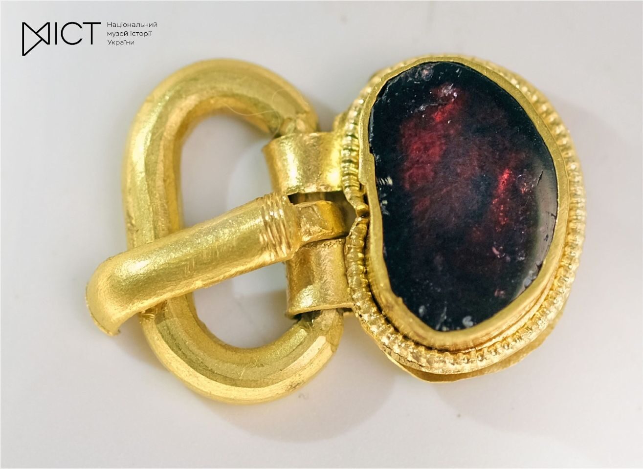 В Национальном музее истории Украины объясняют, что переданный артефакт — это обувная или портупейная пряжка, изготовленная из золота и украшенная большим драгоценным камнем — гранатом. Как отмечают сотрудники музея, эта пряжка скорее всего принадлежала очень высокопоставленному лицу — такие предметы известны из могил королевского ранга.
