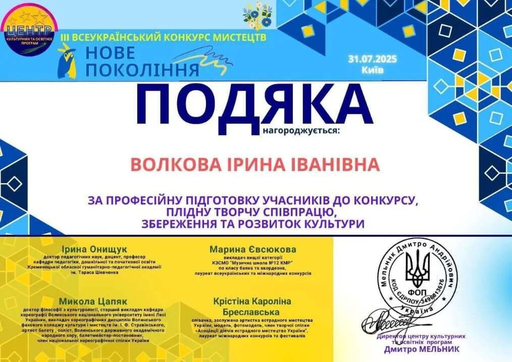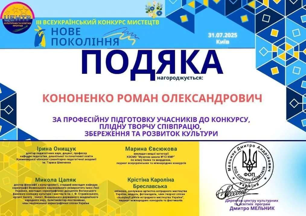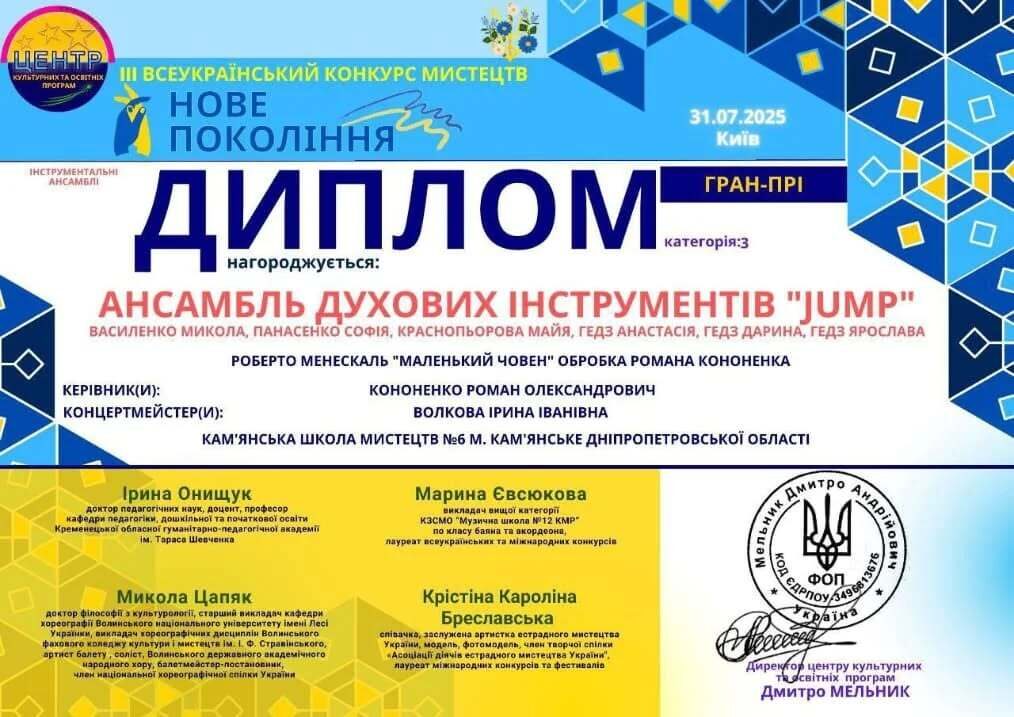 Ансамбль духовых инструментов "Jump" из Художественной школы №6 (руководитель — Р. Кононенко, концертмейстер — И. Волкова) получил высшую награду — Гран-при на III Всеукраинском конкурсе искусств "Новое поколение".