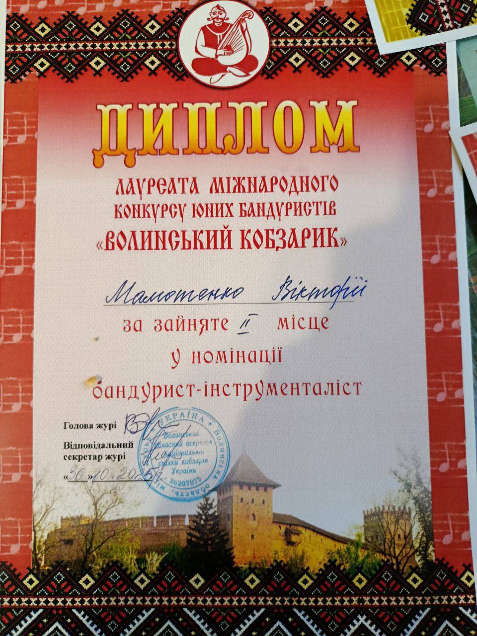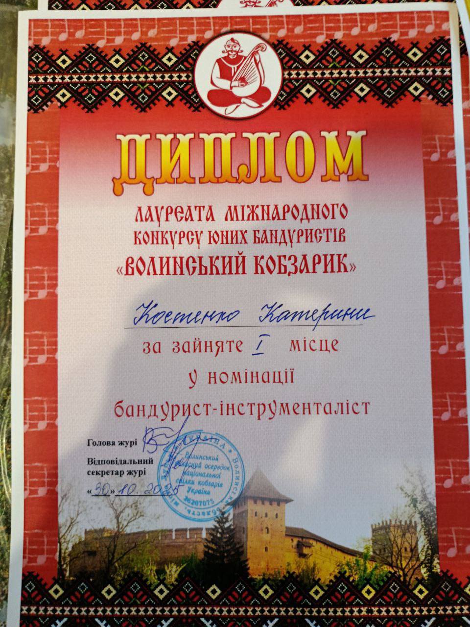 Ученицы класса бандуры Художественной школы №3 города Каменского достойно представили своё учебное заведение и продемонстрировали мастерство и профессионализм. Первое место в номинации "Бандурист-инструменталист" завоевала Костенко Екатерина, второе — Мамотенко Виктория.
