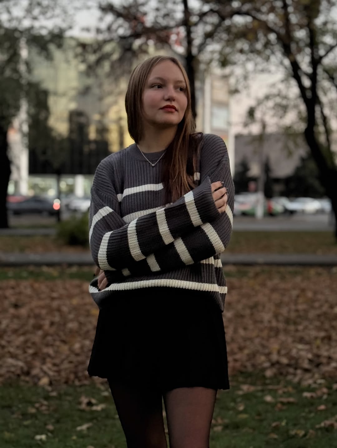 Объемный свитер и юбка – всегда хорошая идея для осени.