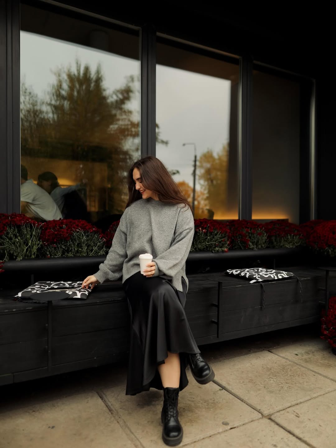 Юбка миди делает этот образ женственным, а свитер – уютным.