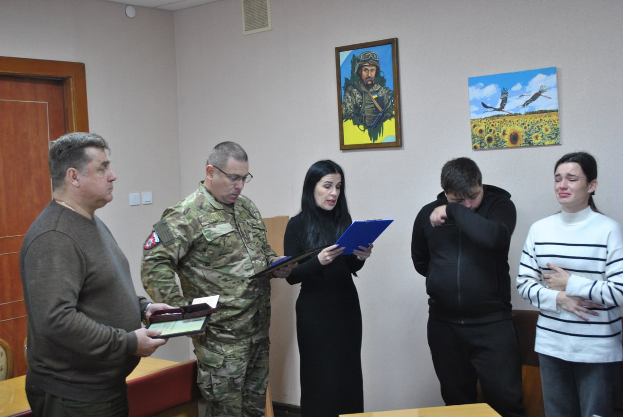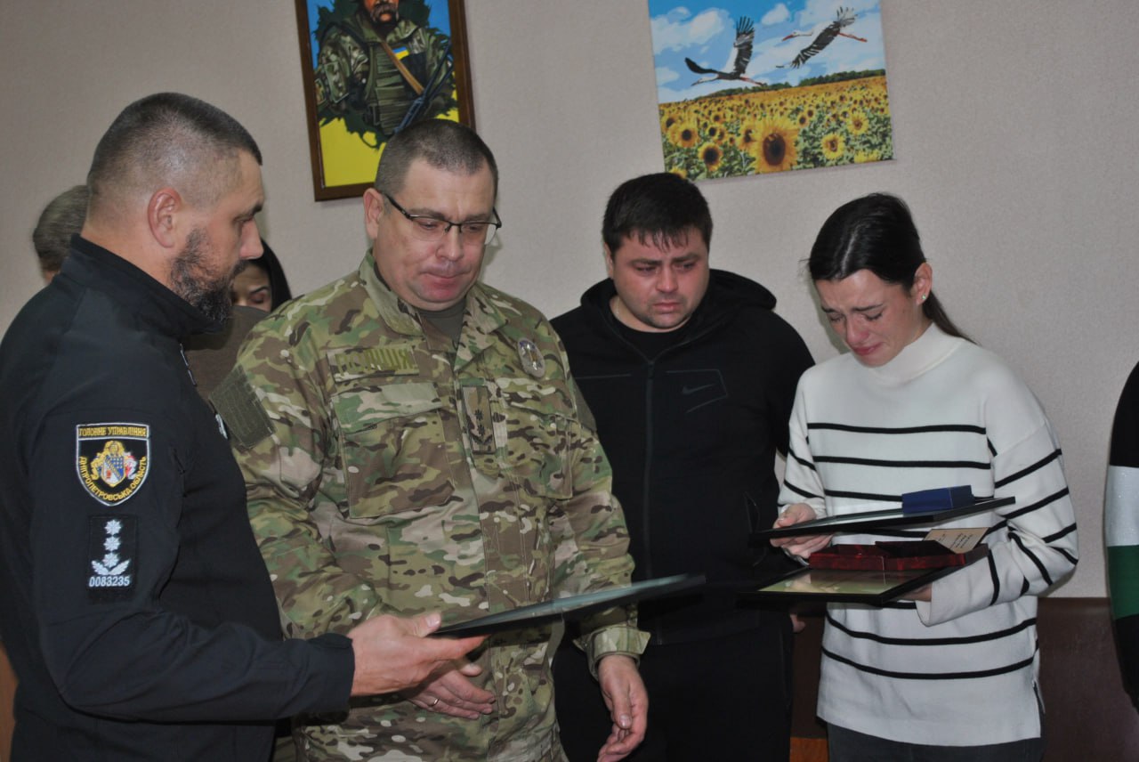 Родным капрала полиции Александра Харитонова вручили ведомственные награды — Нагрудный знак Главнокомандующего ВСУ "Комбатантский крест" и награду "За оборону Украины", которыми посмертно отмечены его мужество, преданность и героизм в служении Украине.