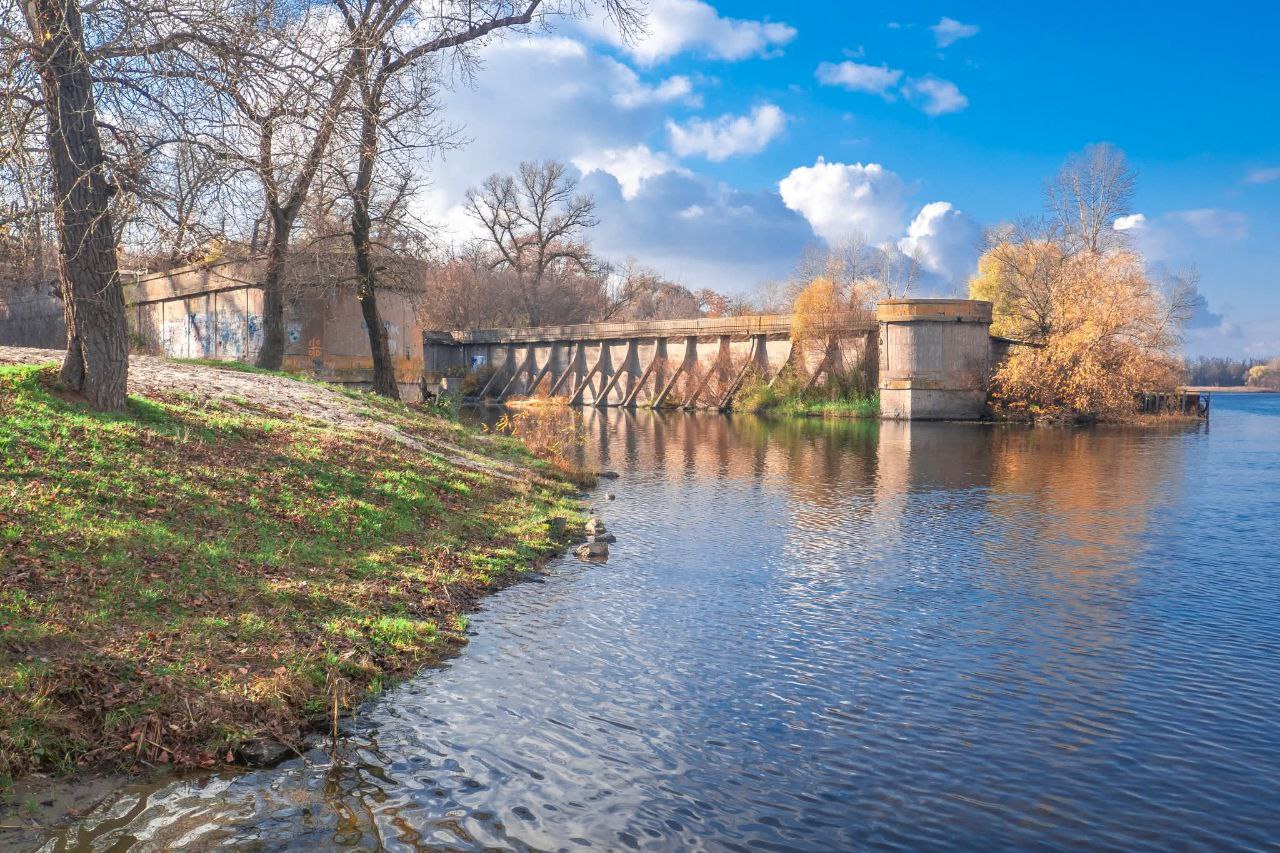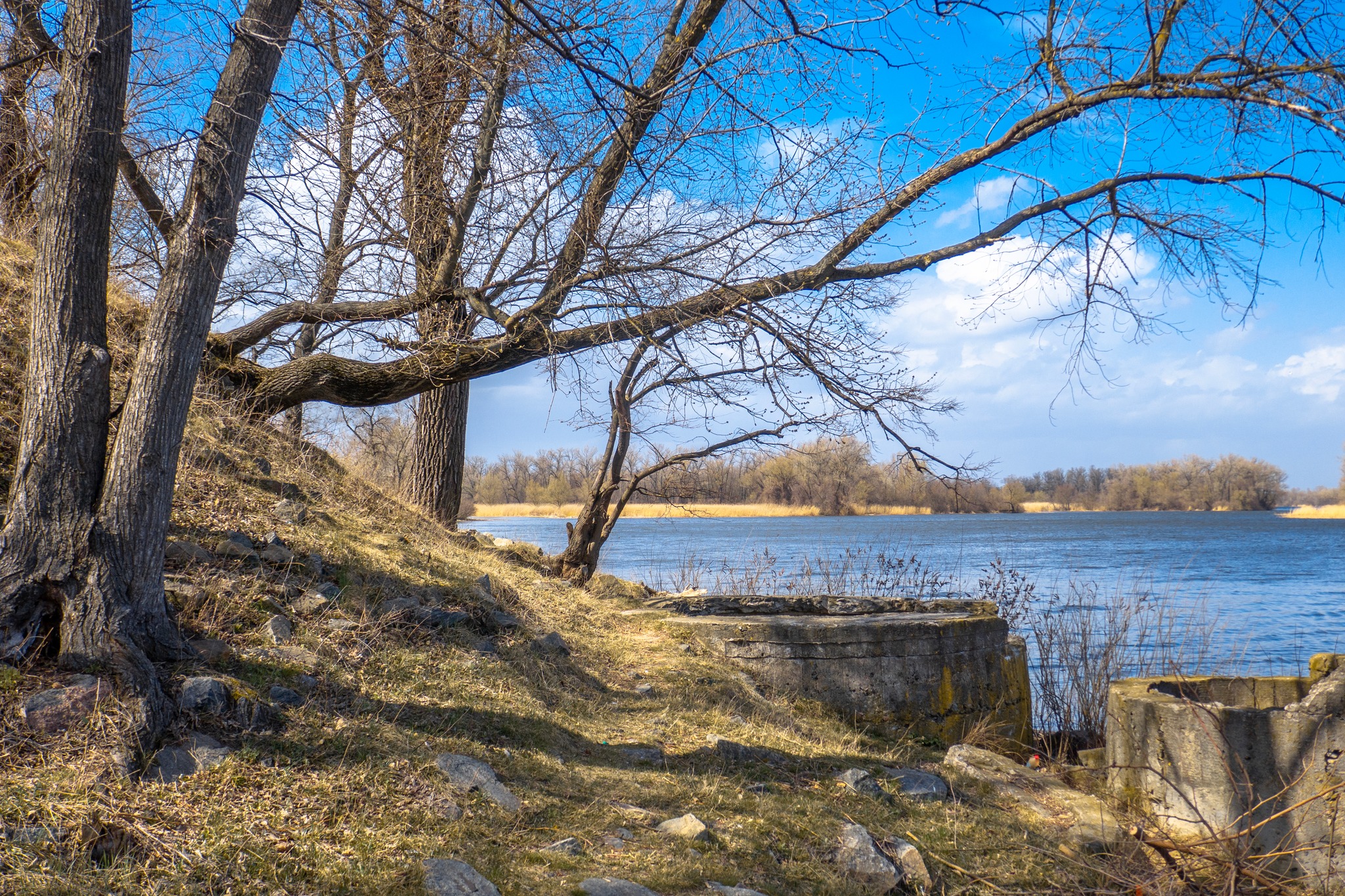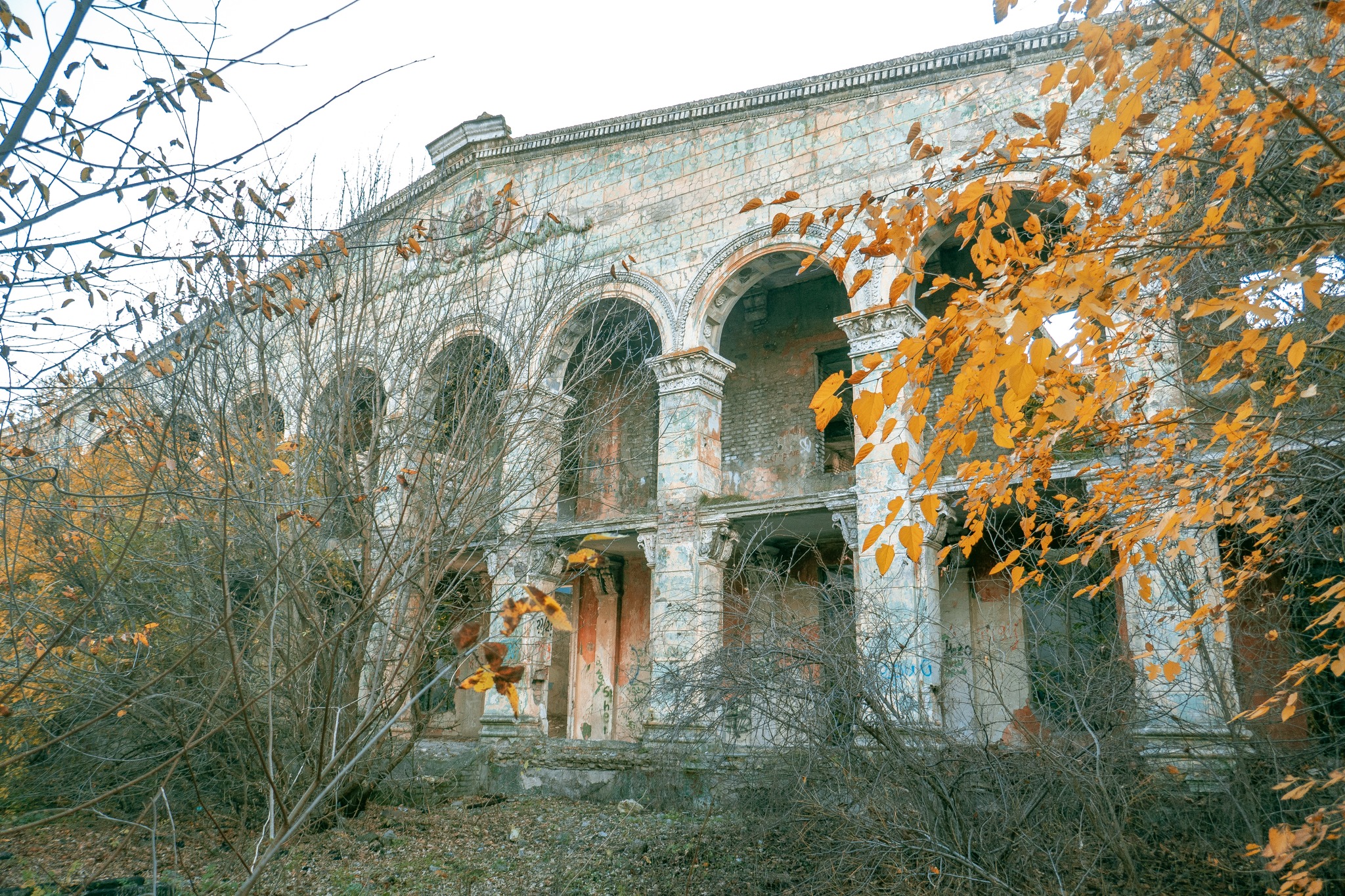 Остатки советского архитектурного наследия. Сейчас это сплошные руины: заросший лес и заброшенные постройки, где трудно представить детский смех. А когда-то здесь, в 1955 году, на холме над Днепром построили главный корпус лагеря для детей строителей города, а впоследствии и работников цементного завода.