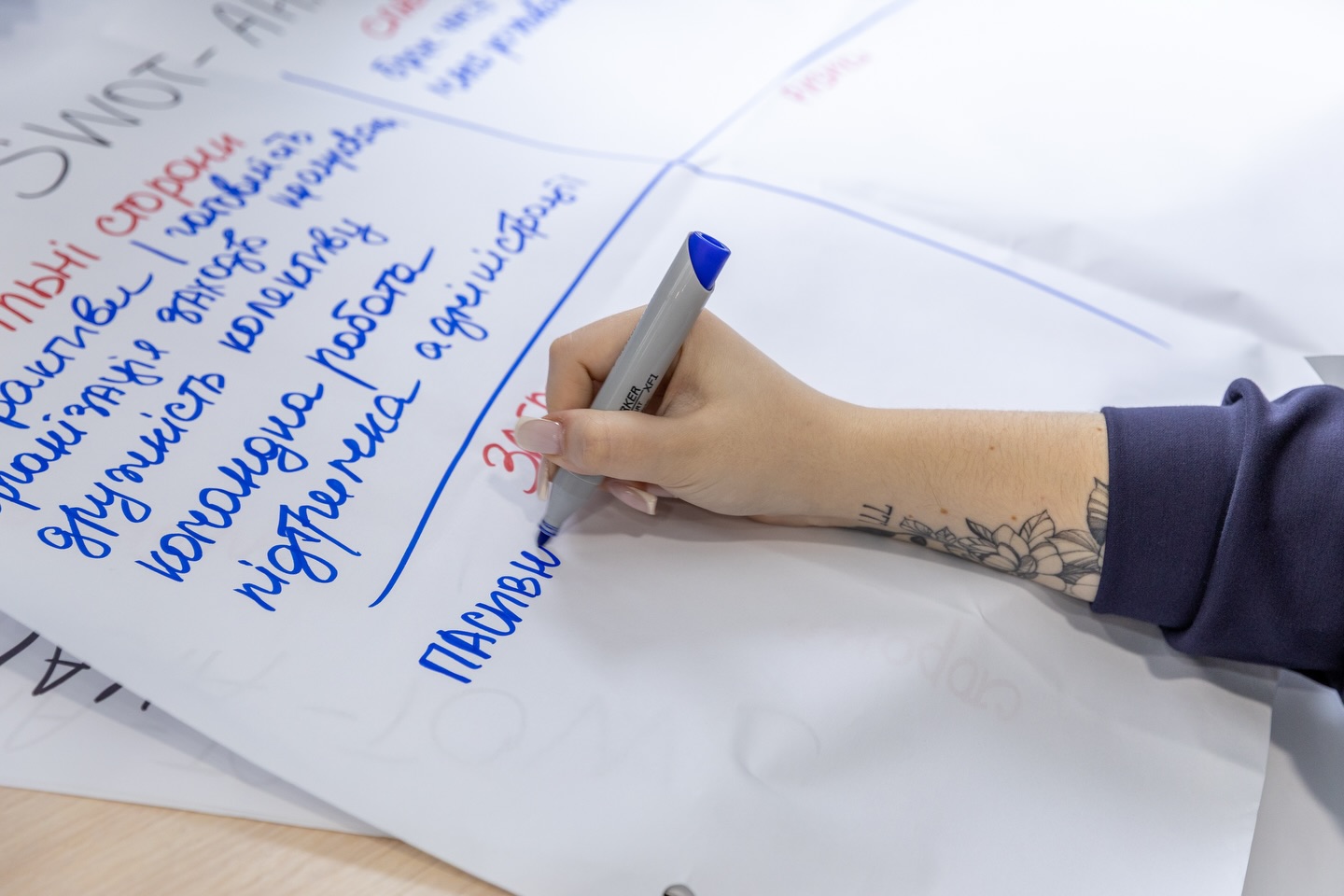 В практическом блоке участники и участницы объединились в группы, в которых работали над собственным видением школьного самоуправления, определяли сильные и слабые стороны, формировали первые идеи развития и проводили мини-SWOT-анализ.