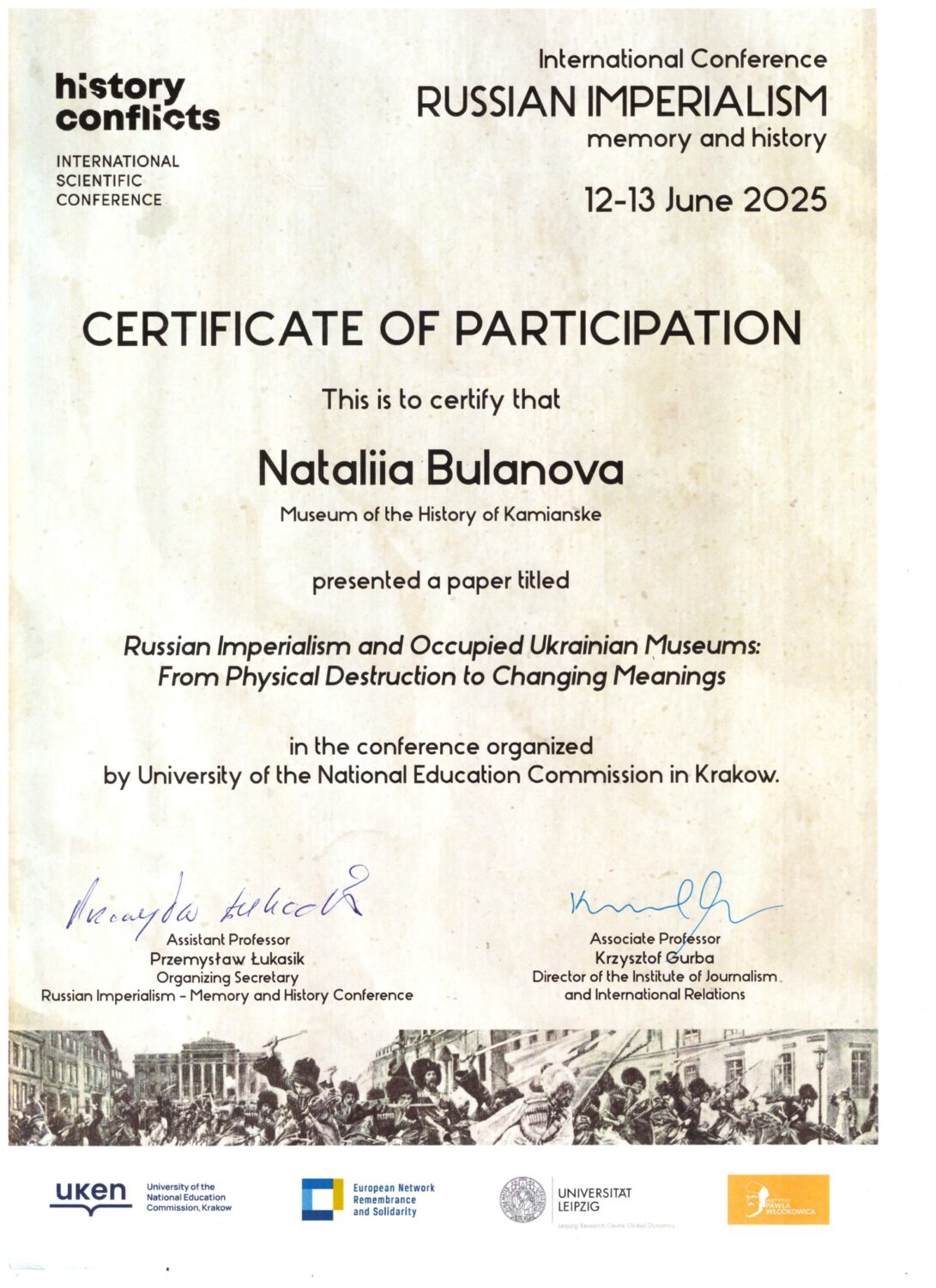 Каменское на этом научном форуме представила директор Музея истории города Наталия Буланова с исследованием "Российский империализм и оккупированные украинские музеи: от уничтожения до изменения смыслов" об актуальных проблемах влияния российской имперской политики на деятельность украинских музеев, временно находящихся в оккупации, начиная с 2014 года.