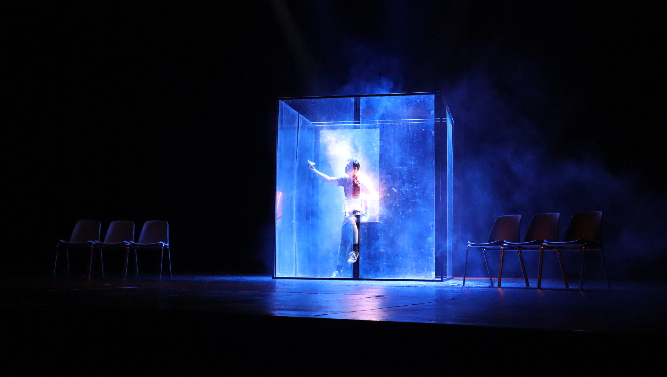 Режиссура мастерски использует минимализм для максимального эффекта, заставляя зрителя полностью сосредоточиться на диалоге и символике.  Костюмы героев сразу намекают на их внутреннюю драму. Особо обращает на себя внимание белый асимметричный костюм Текселя, который сразу привлекает внимание и дает понять, что с этим персонажем "что-то не так". Стеклянный куб на сцене — это мощный режиссерский прием. Он служит и порталом в прошлое, и зеркалом, в котором периодически искаженно отражаются герои, что усиливает психологический эффект.