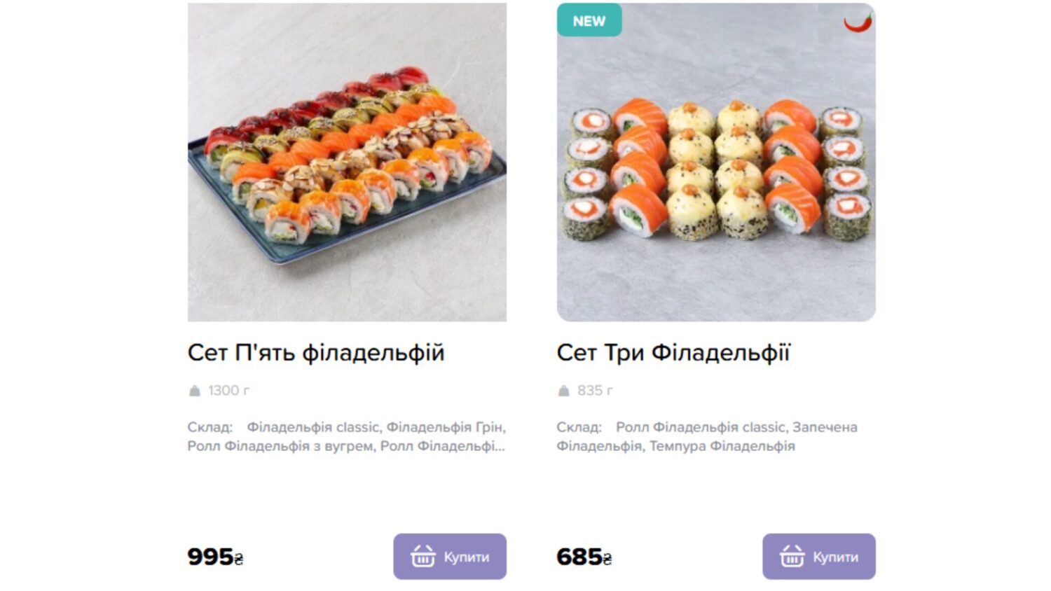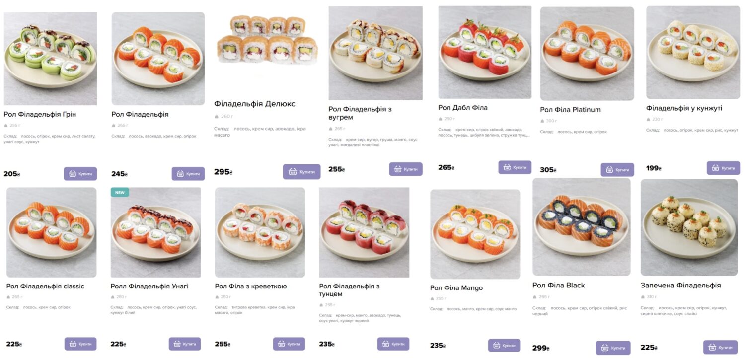 Следующее заведение — "IKURA". Цена роллов "Филадельфия" — 199–299 грн. Средний вес ролла — 265 г. Цена за сет — 685 грн за 835 г и 995 грн за 1300 г.
