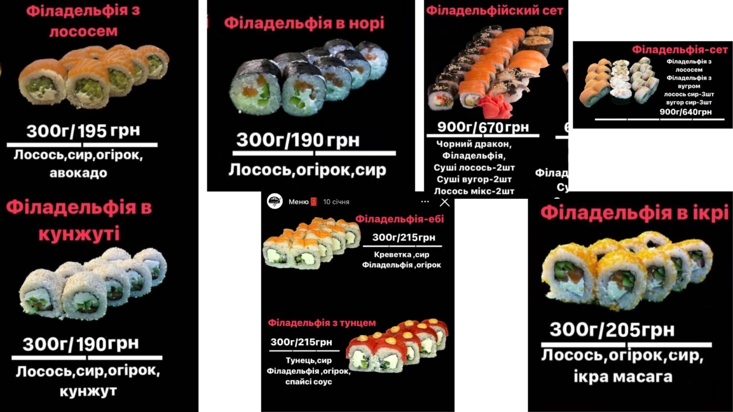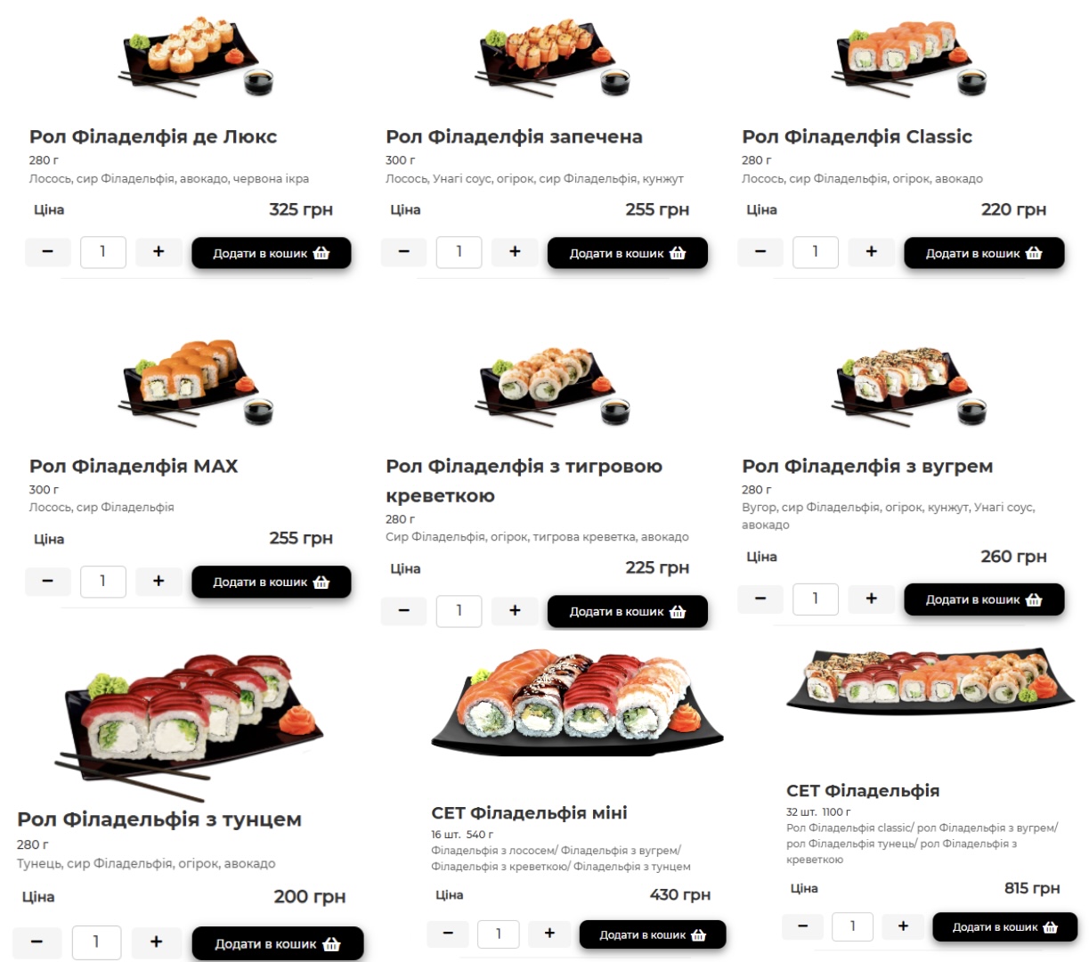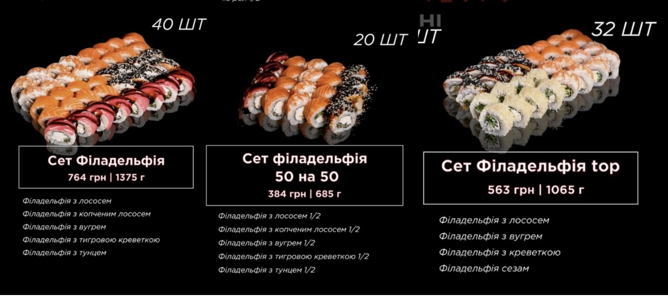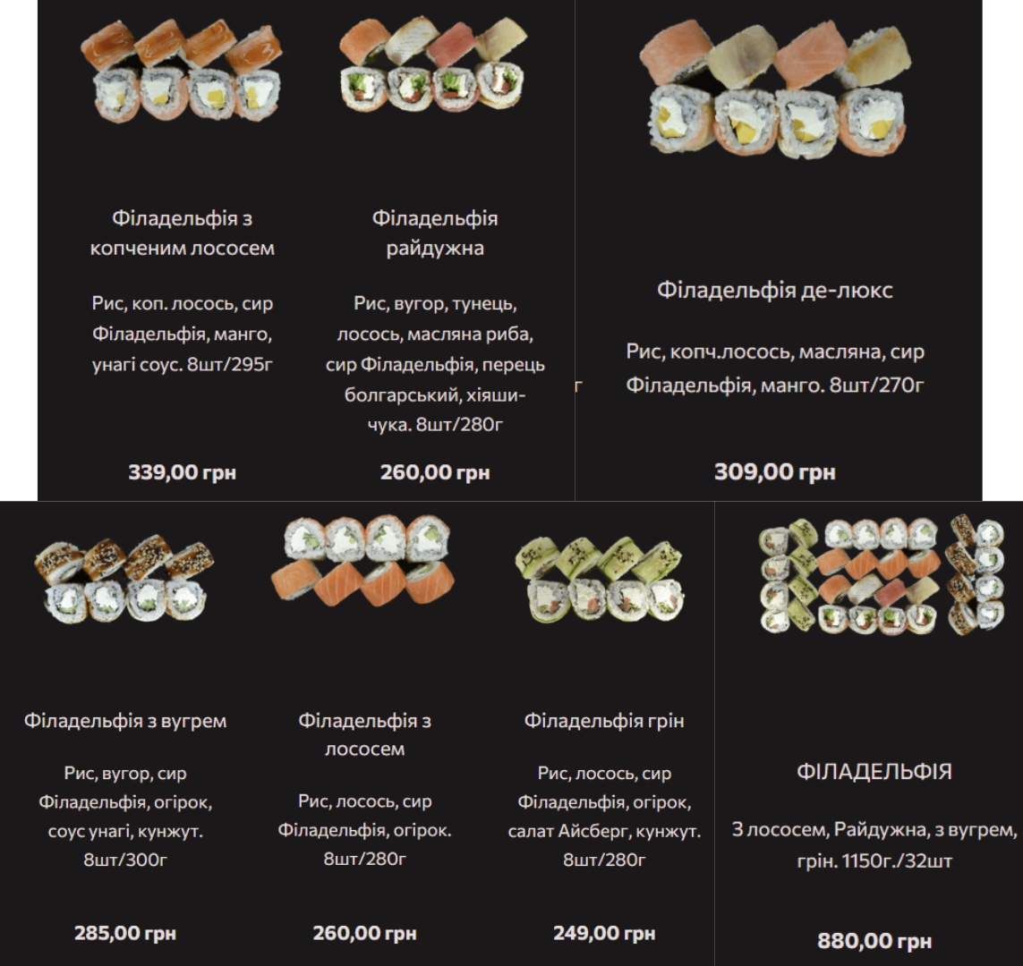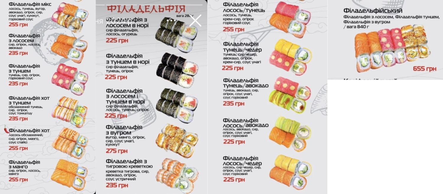 Хороший выбор суши "Филадельфия" есть в "Суши&Пицца гастро". Цены здесь примерно такие же, как и в других заведениях. Ролл весом 280–300 г стоит 200–325 грн. Сет — 430 грн за 549 г и 815 грн за 1100 г.