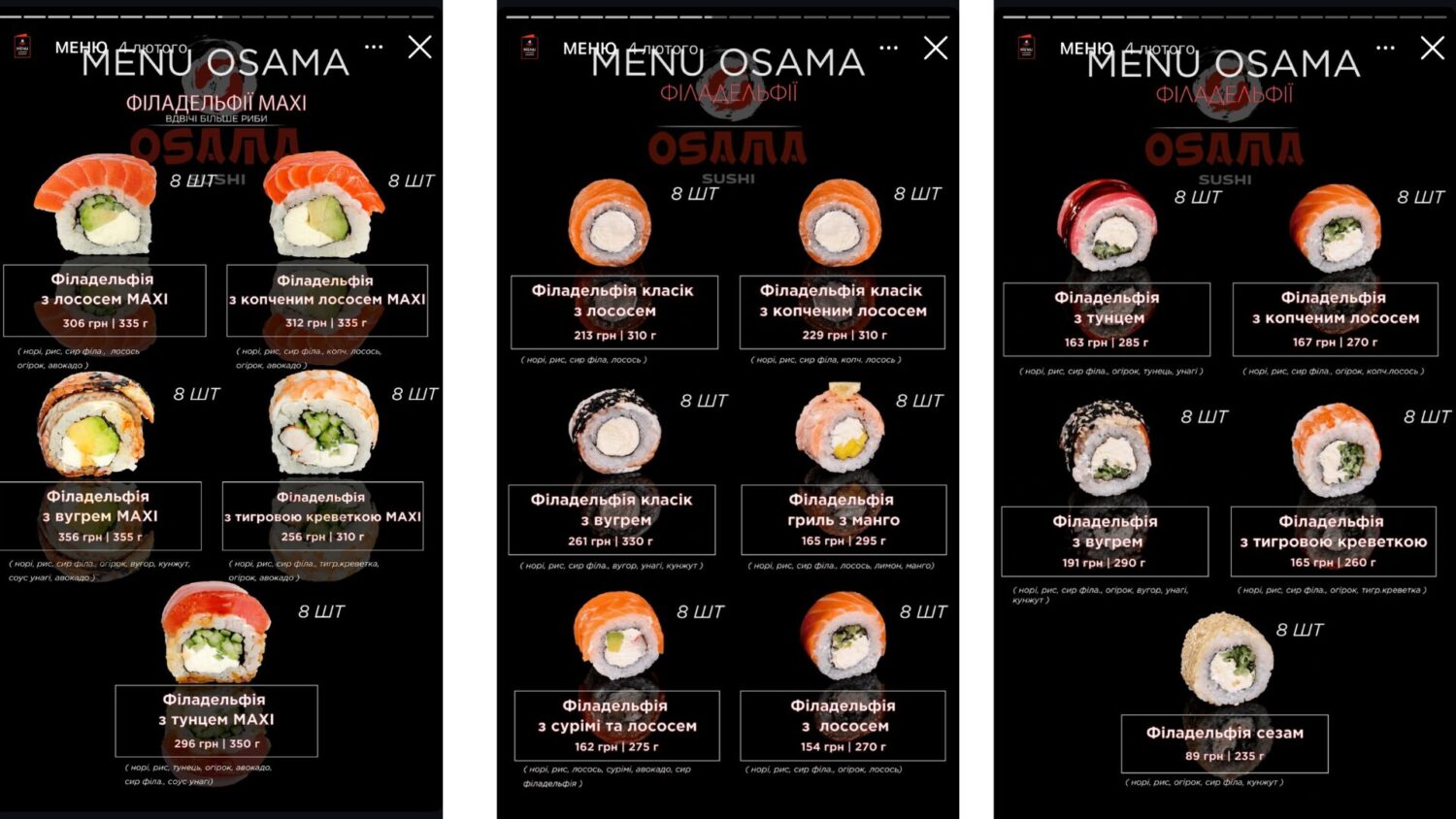Также популярное в нашем городе заведение — "Osama". Выбор здесь больше как по количеству позиций, так и по ценам. Цены на ролл из 8 штук начинаются от 89 грн и заканчиваются 356 грн. Здесь есть три сета "Филадельфия" по цене 384 грн, 563 грн, 764 грн и весом 685 г, 1065 г, 1375 г соответственно.