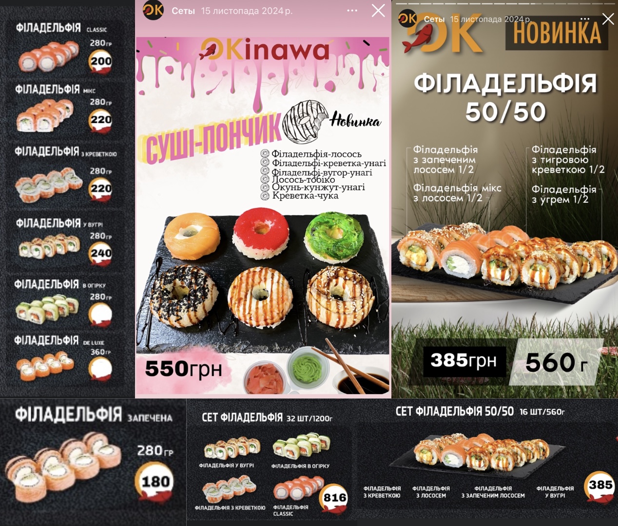 Начнём с "Okinawa". Цена на ролл "Филадельфия" здесь стартует от 200 грн за 280 г. Есть и сеты, что немного выгоднее и разнообразнее по вкусу — 385 грн за 560 г. Для любителей чего-то необычного здесь есть суши-пончики. Их цена — 550 грн.
