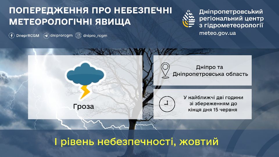 В ближайшие часы с сохранением до конца дня 15 июня в Каменском и по Днепропетровской области ожидается сильная гроза. Объявлен I уровень опасности (желтый).