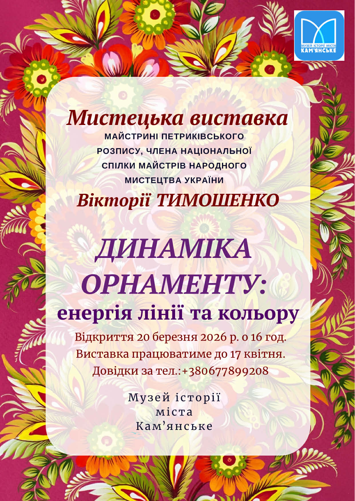 Музей истории города приглашает жителей и гостей Каменского на встречу с искусством, дышащим энергией и цветом. В пятницу, 20 марта, в 16:00 состоится открытие персональной выставки Виктории Тимошенко под названием "Динамика орнамента: энергия линии и цвета".