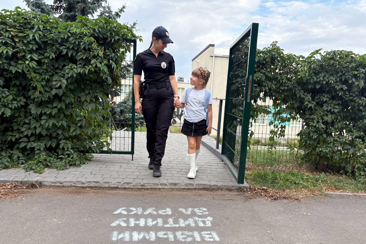 Возле одного из учебных заведений города полицейские службы образовательной безопасности вместе со старшеклассниками организовали акцию "Возьми ребенка за руку" и нанесли такую надпись перед выходами из школы.