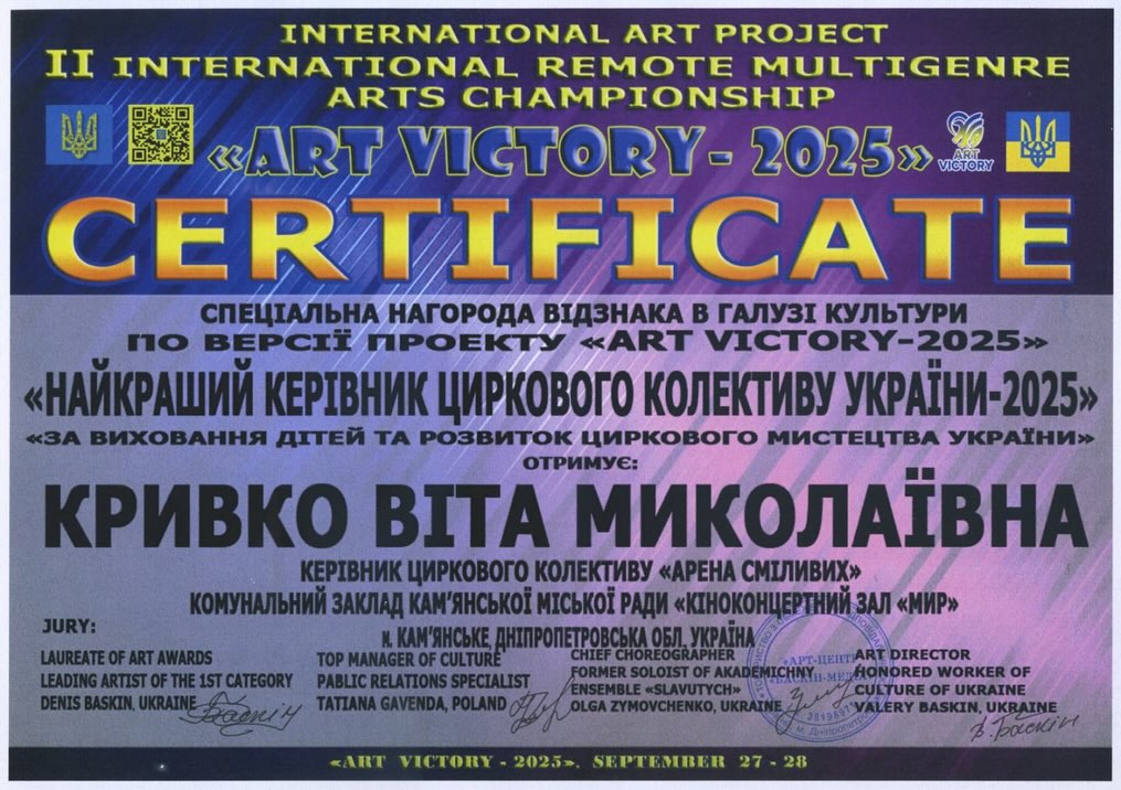 Её наставница, Вита Кривко, получила сертификат "Лучший руководитель циркового коллектива Украины – 2025" за значительный вклад в развитие циркового искусства в стране.