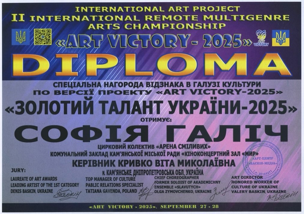 София Галич, участница циркового коллектива "АРЕНА СМЕЛЫХ" Киноконцертного зала "МИР", заняла первое место и получила почётное звание "Золотой талант Украины – 2025".