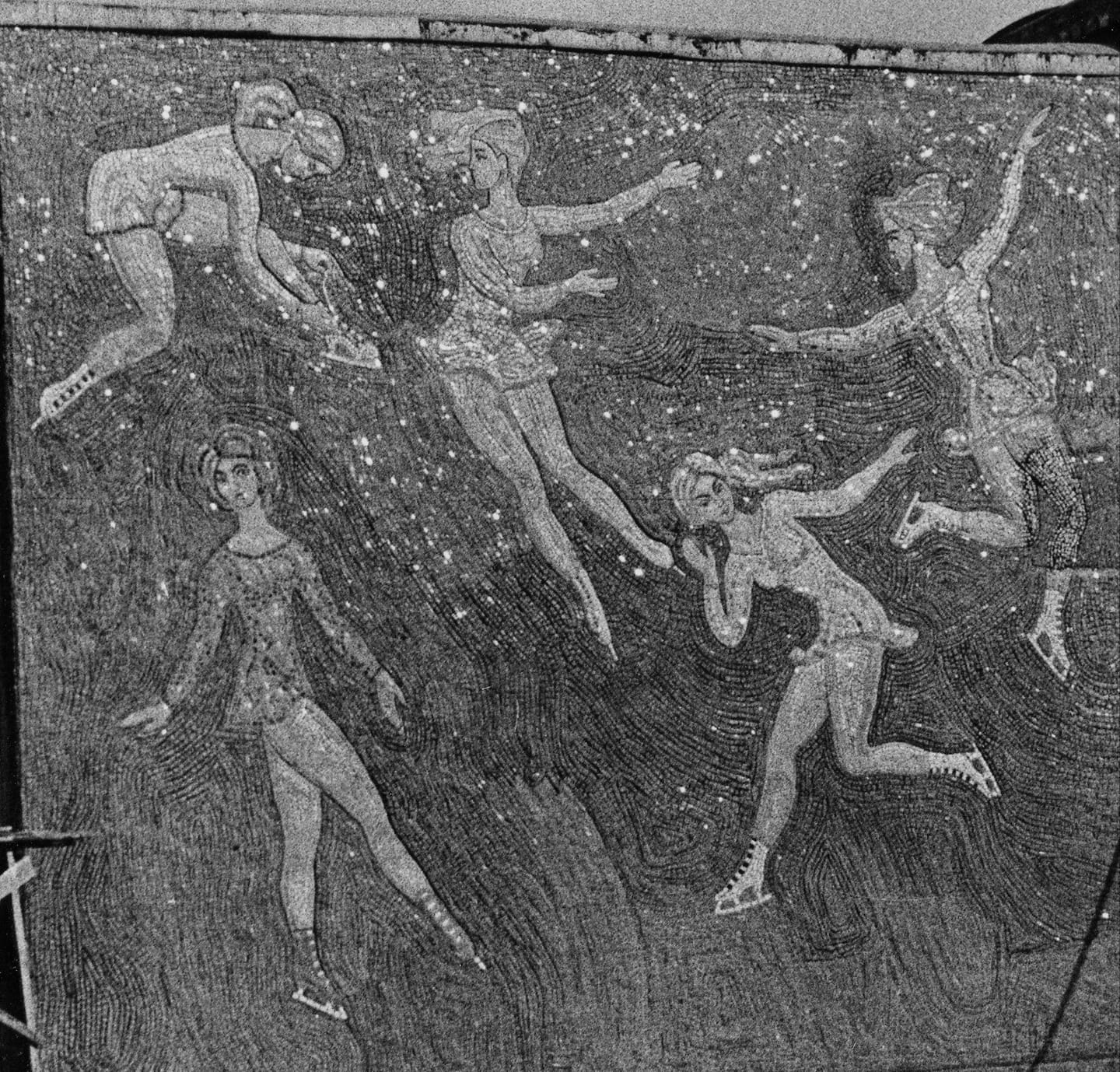 Несколько позже, в 1971 году, выдающийся украинский художник Валерий Ламах – автор мозаичного панно "К Солнцу" на главном фасаде "Химика", росписи "Жизнь" в его интерьере и мозаичной плиты фонтана "Круг знаков" перед дворцом – украсил здание кафе смальтовой мозаикой "На льду", где на голубом искрящемся фоне кружили пять девушек-конькобежиц.