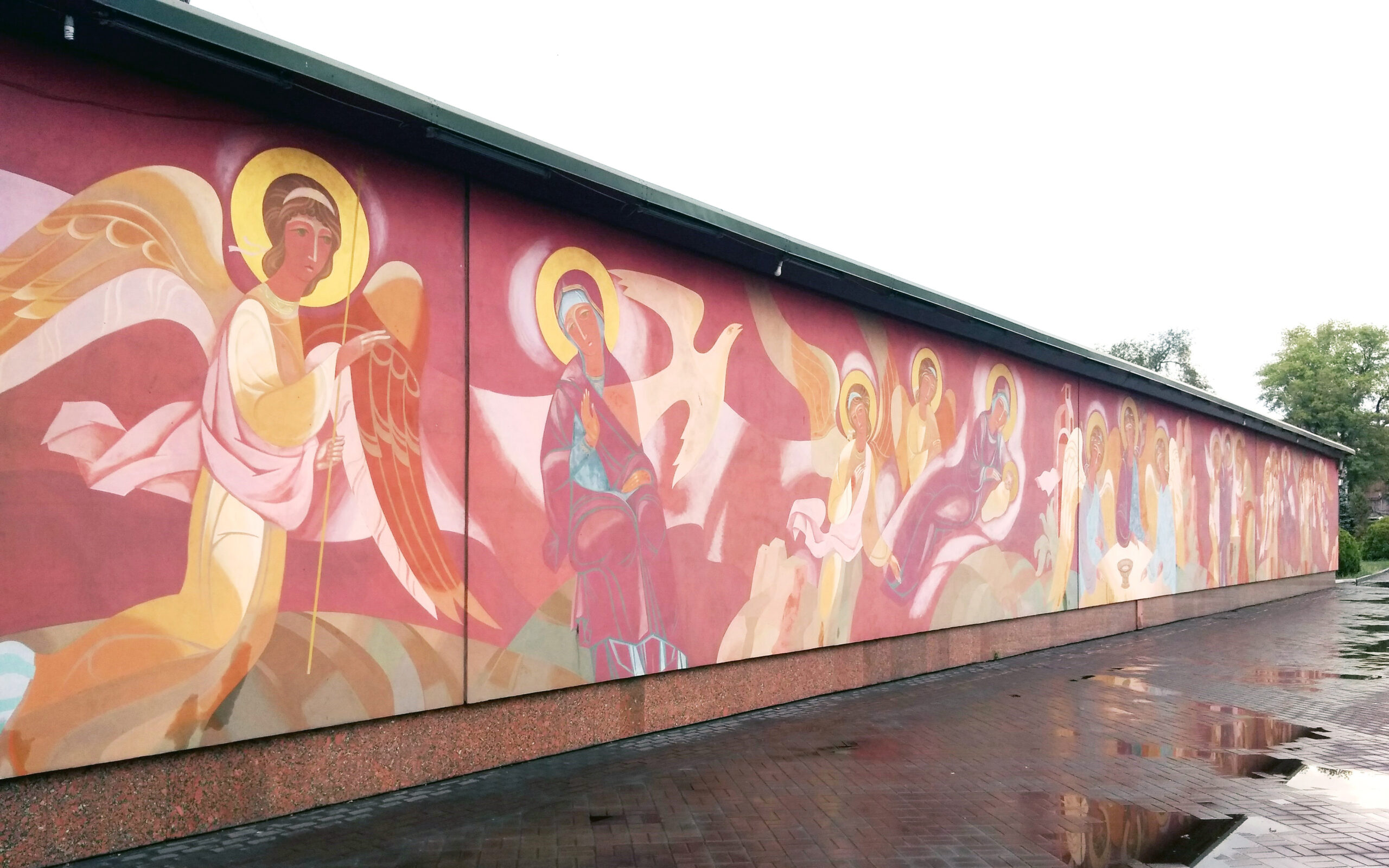 Скульптуру дополнило большое живописное панно на восточном фасаде Академического музыкально-драматического театра имени Леси Украинки. Авторами его стали члены Национального союза художников Украины Александр Чегорка и Сергей Лаушкин. В росписи объединены пять сюжетных композиций: Благовещение, Рождество, Троица, Сретение, Вход Господень в Иерусалим.