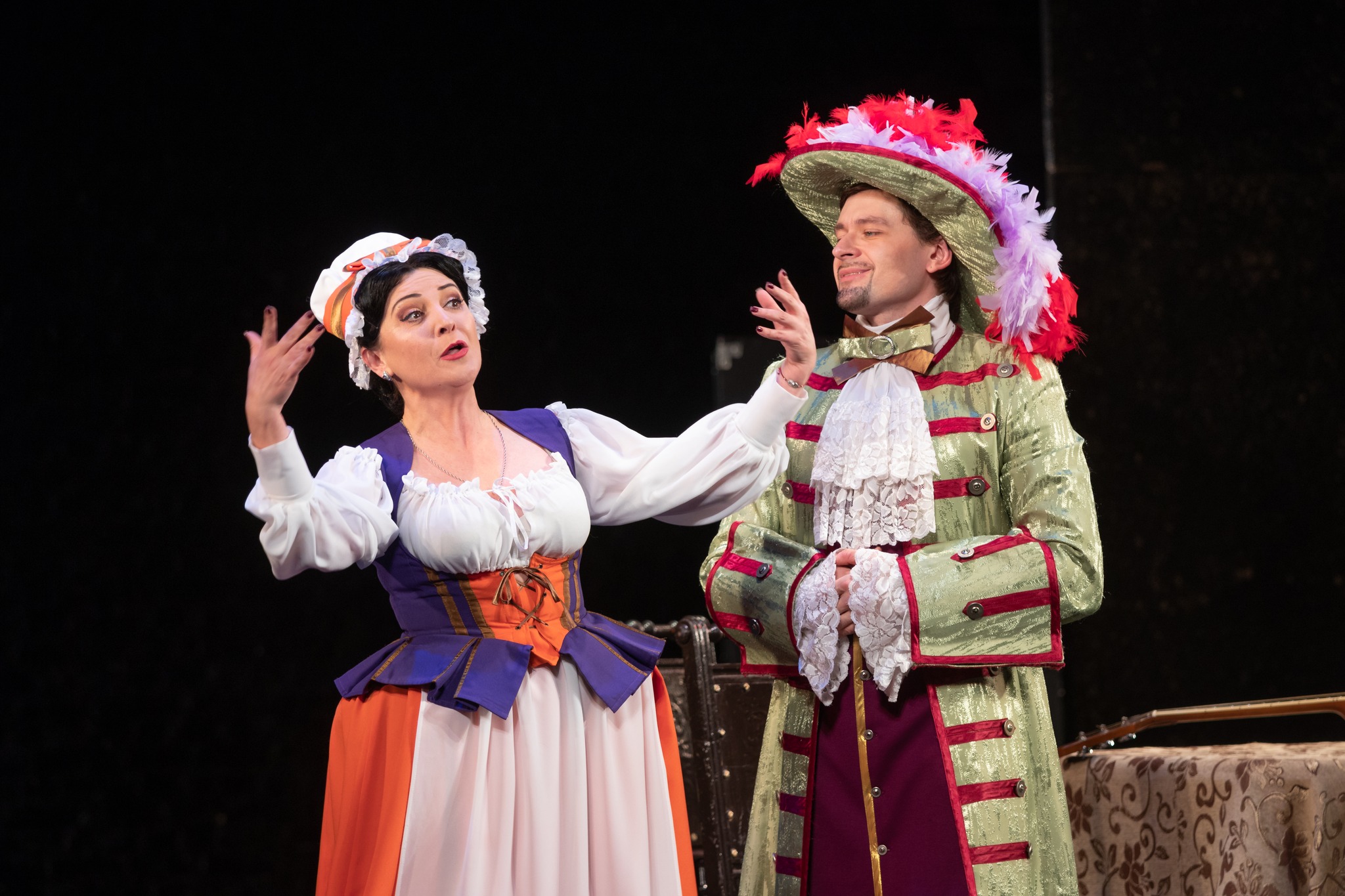 Не менее интересно наблюдать за костюмами в легендарном "Тартюфе". Это настоящий триумф барочной моды: члены семьи парижского буржуа Оргона украшают головы подлинными произведениями искусства, тогда как сам Тартюф в напускной скромности довольствуется вязаной шапочкой.