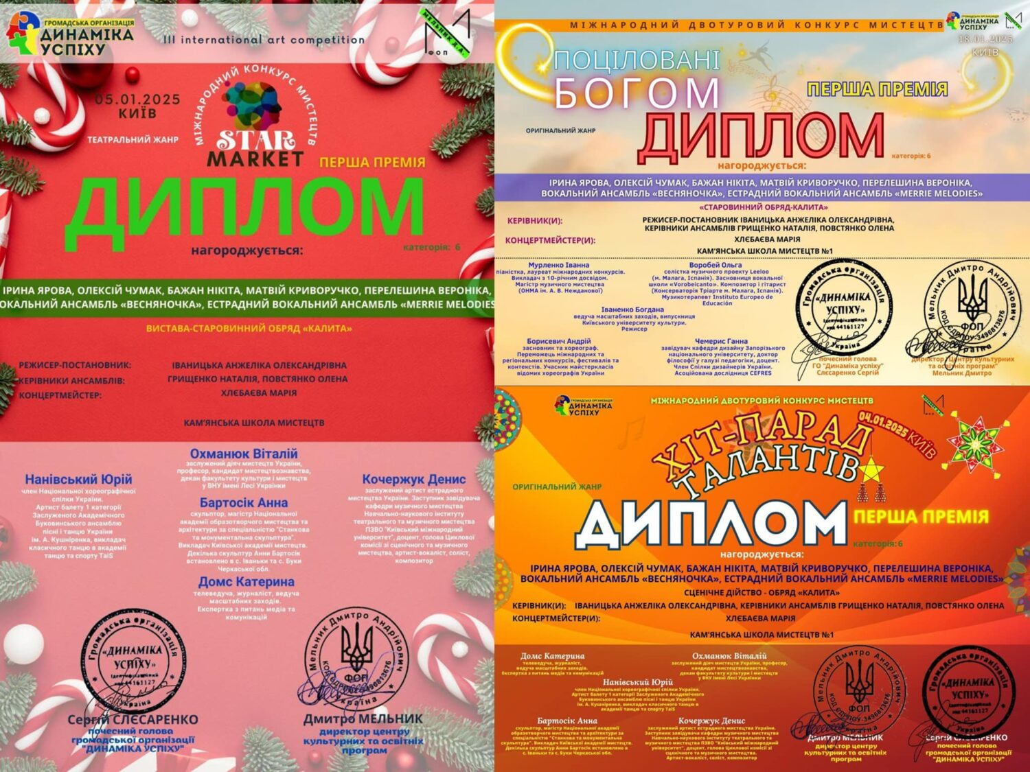 • 1 место на Международном конкурсе искусств "Star Market" (05.01.2025, Киев).