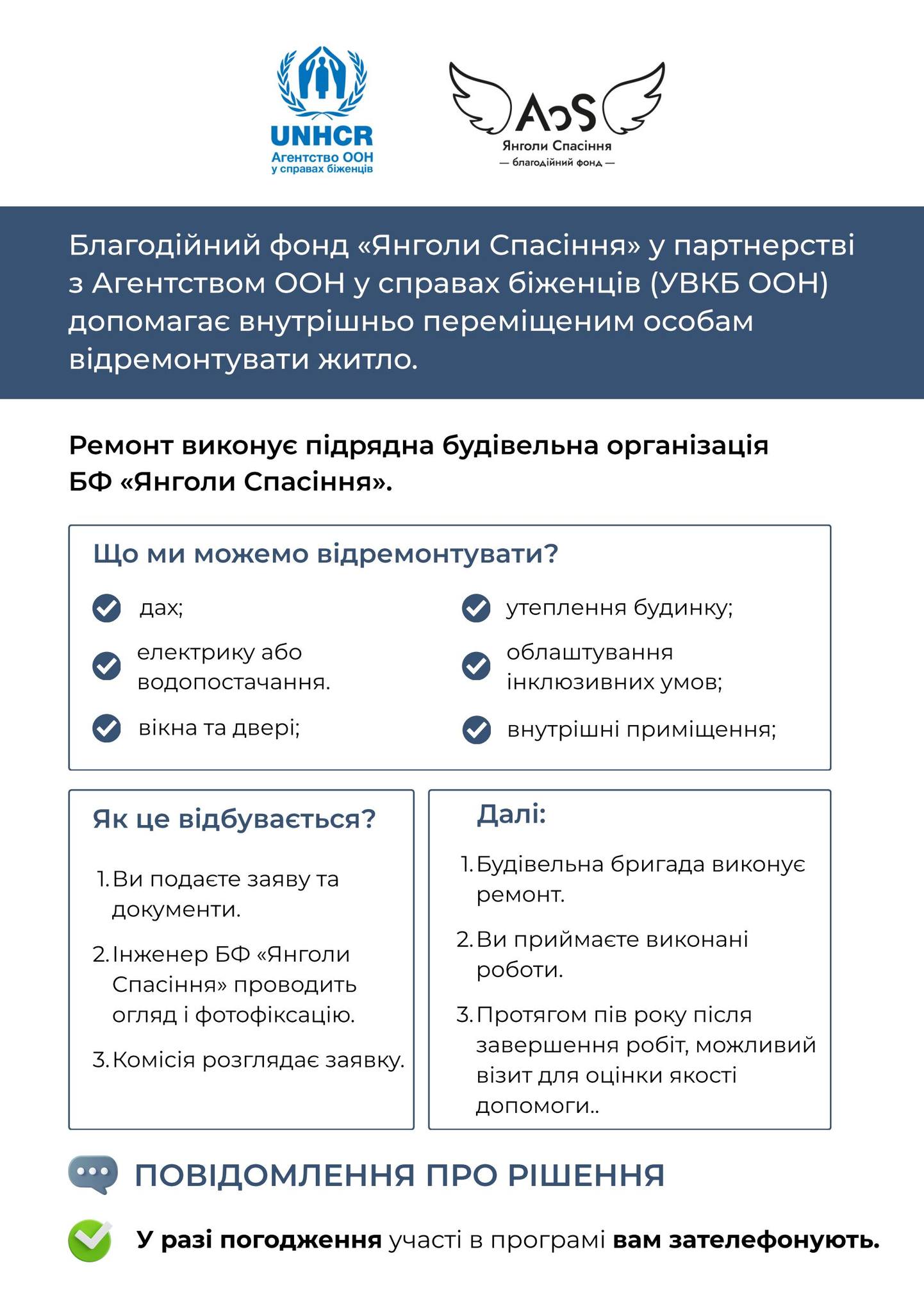 Благотворительный фонд "Янголи Спасіння" совместно с Агентством ООН по делам беженцев открывают регистрацию на участие в программе поддержки для внутренне перемещенных лиц. Эта инициатива помогает людям, которые нашли приют в нашем районе, бесплатно отремонтировать свои дома и создать достойные условия для жизни.