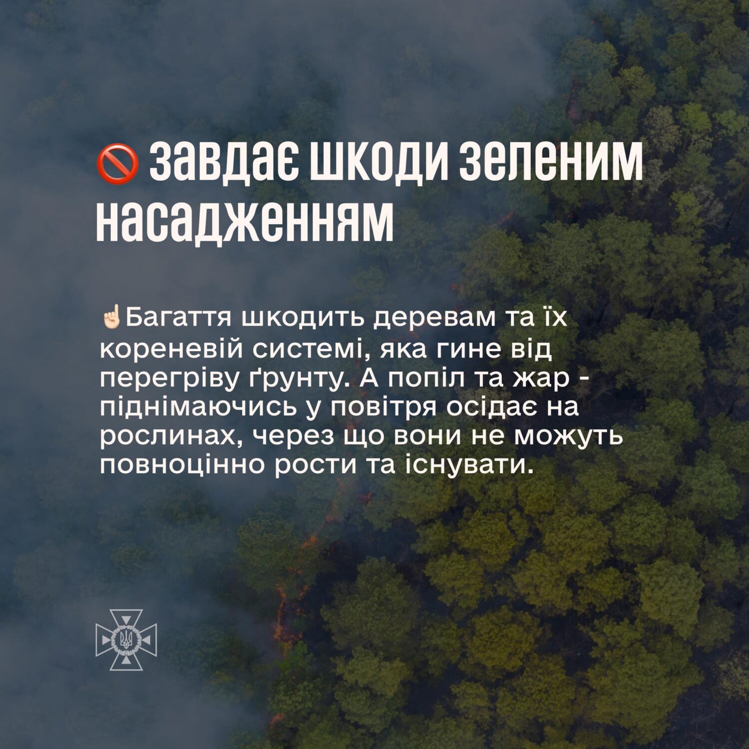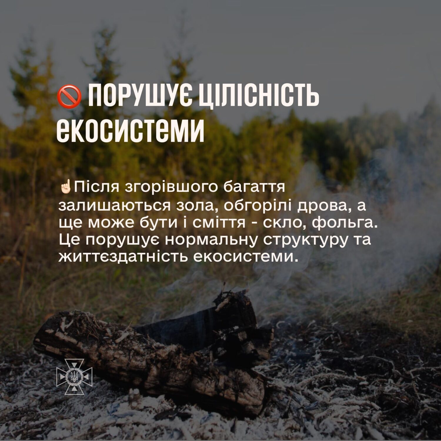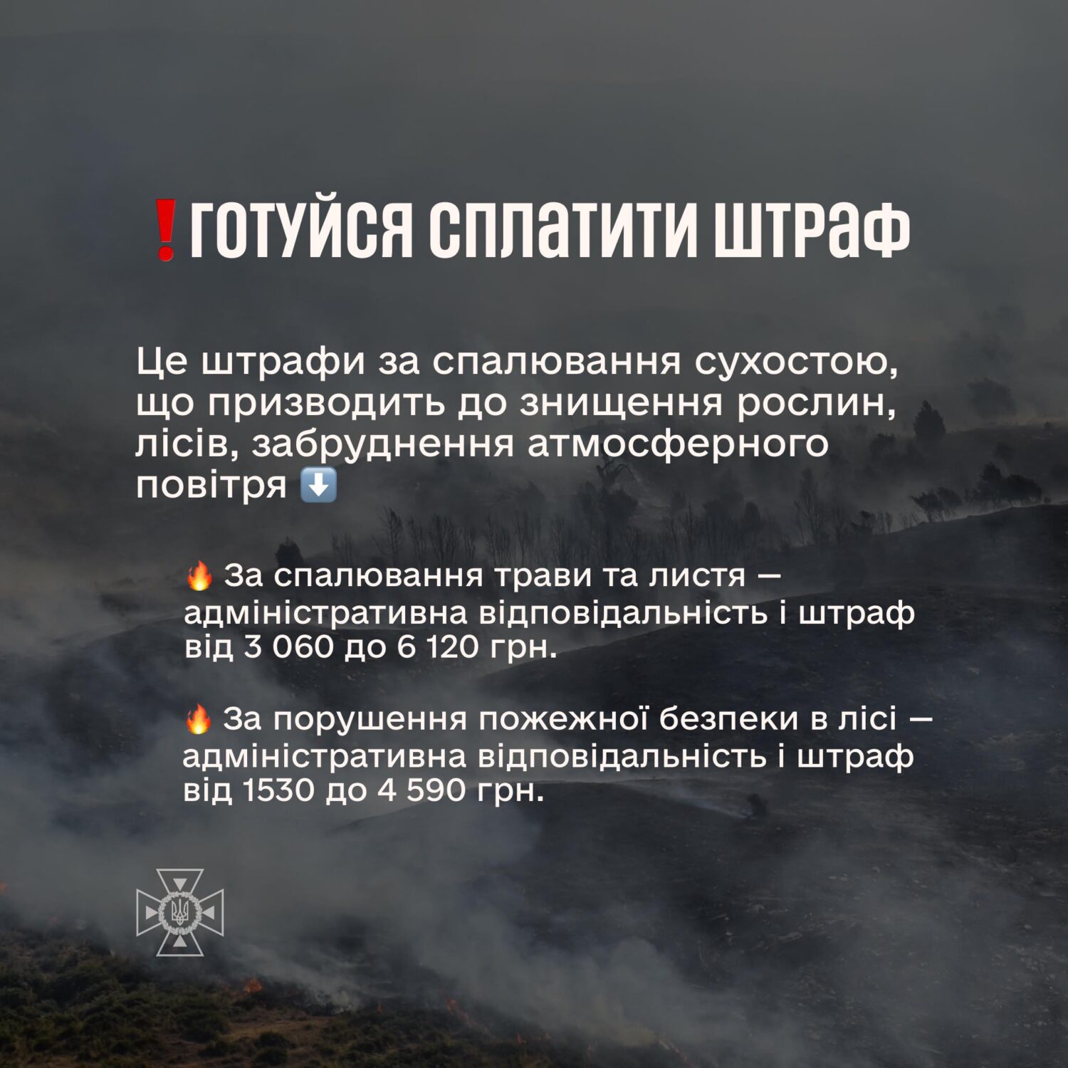 Стоит помнить: за сжигание травы и листьев предусмотрена административная ответственность и штраф от 3060 до 6120 грн. А за нарушение пожарной безопасности в лесу — штраф от 1530 до 4590 грн.