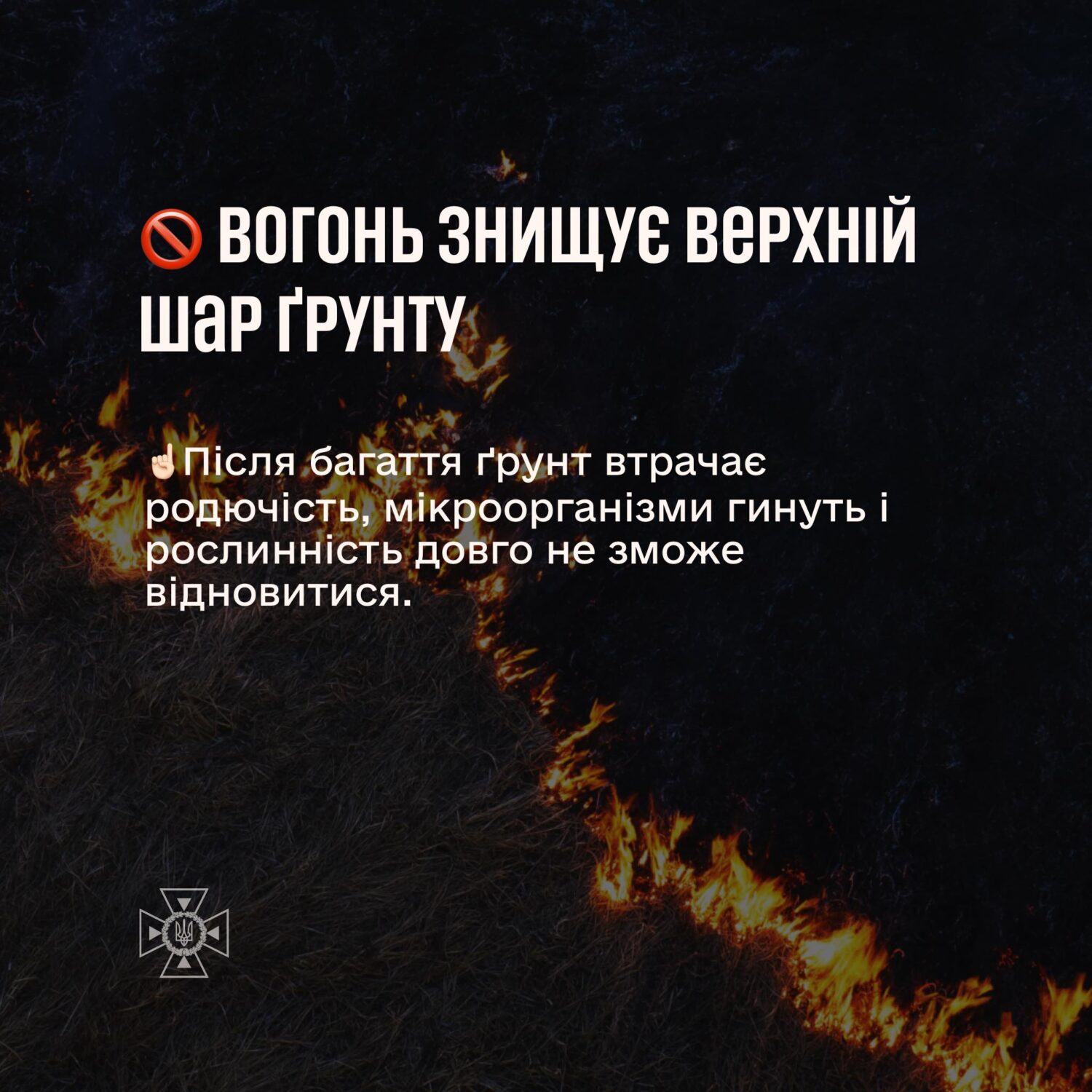 Огонь уничтожает верхний слой почвы, из-за чего она теряет плодородие. Гибнут микроорганизмы, а растительность долго не может восстановиться. Сильно страдают животные, птицы и насекомые. У них обостренная реакция на запах дыма, и они можуть покинуть свои жилища, даже если нет открытого огня.