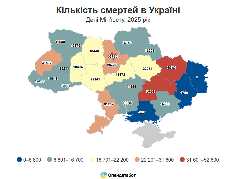 За прошлый год область зафиксировала наибольшее количество умерших среди всех регионов страны. Согласно аналитике "Опендатабот", в течение 2025 года в регионе ушли из жизни 52 559 человек. Следующими в списке по этому показателю идут Киев (36,2 тысячи) и Харьковщина (34,6 тысячи человек).
