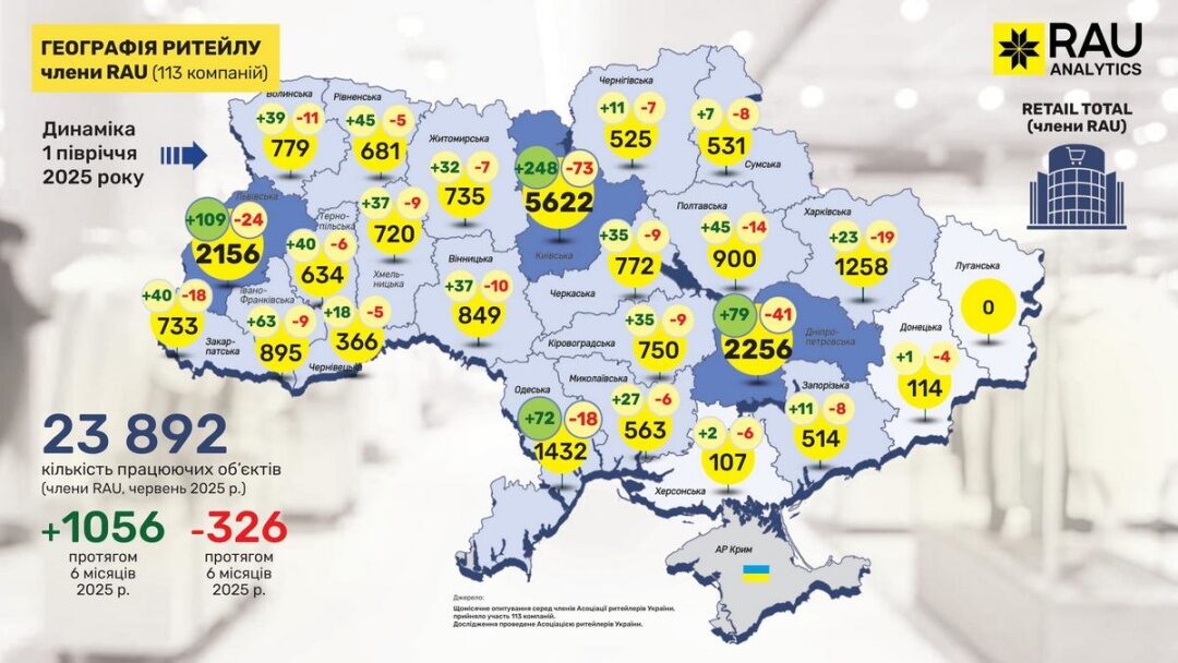 В первой половине 2025 года на территории Украины наблюдается активное расширение торговой сети. За шесть месяцев было открыто 1056 новых магазинов, в то время как 326 торговых точек прекратили работу. Таким образом, прирост составил 730 объектов розничной торговли.