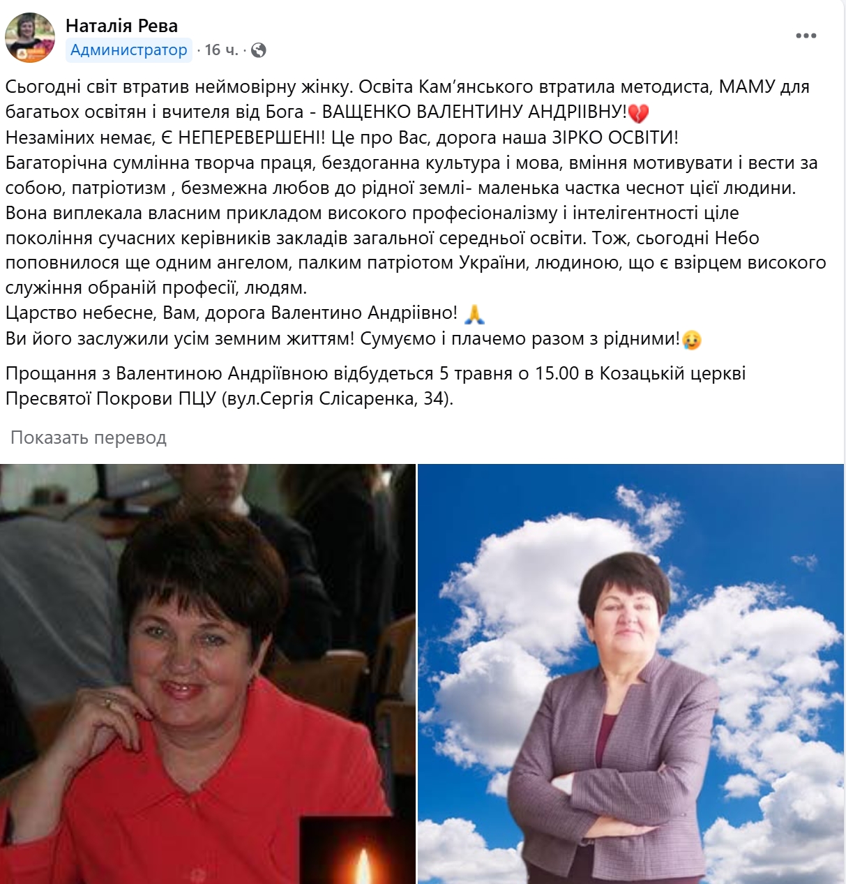 Сегодня мир потерял невероятную женщину. Образование Каменского потеряло методиста, МАМУ для многих педагогов и учителя от Бога — ВАЩЕНКО ВАЛЕНТИНУ АНДРЕЕВНУ!Незаменимых нет, ЕСТЬ НЕПРЕВЗОЙДЕННЫЕ! Это о Вас, дорогая наша ЗВЕЗДА ОБРАЗОВАНИЯ!, — написала директор департамента образования городского совета Наталья Рева.