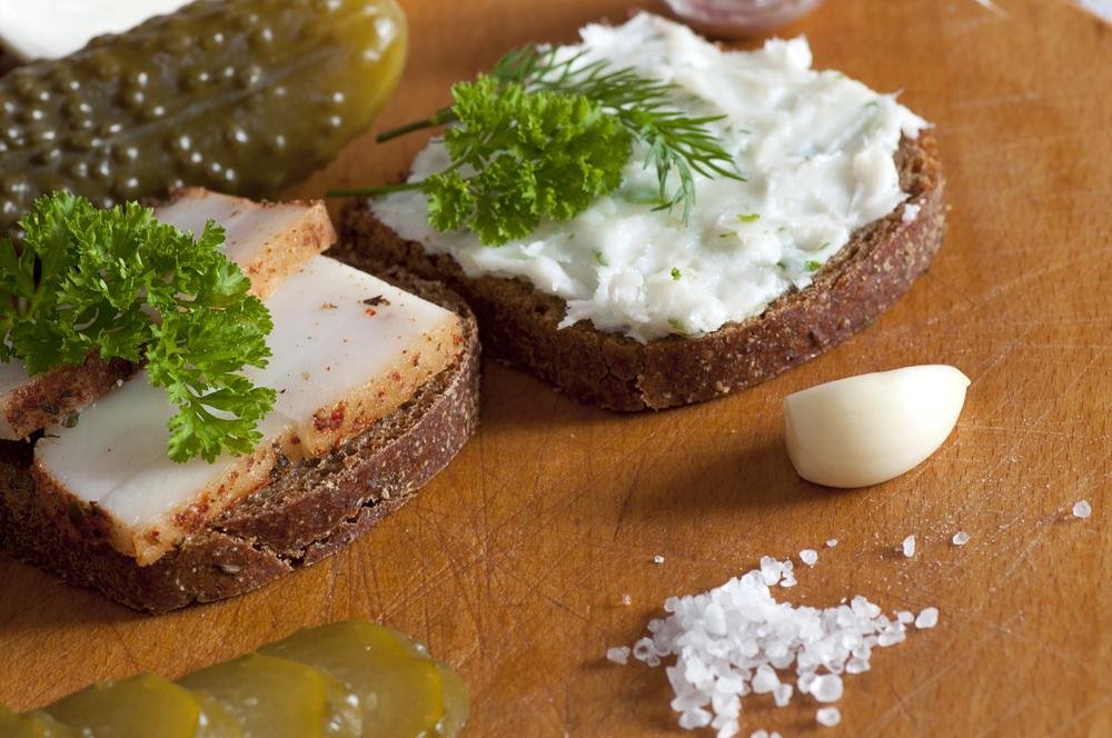 В Украине распространено употребление молотого сала с чесноком. Эта пикантная закуска известна с давних времен и была любимым блюдом украинских казаков. Обычно при приготовлении этого блюда берут на 300 граммов сала одну среднюю головку чеснока. Соль, черный молотый перец и зелень — добавляют по своему вкусу.