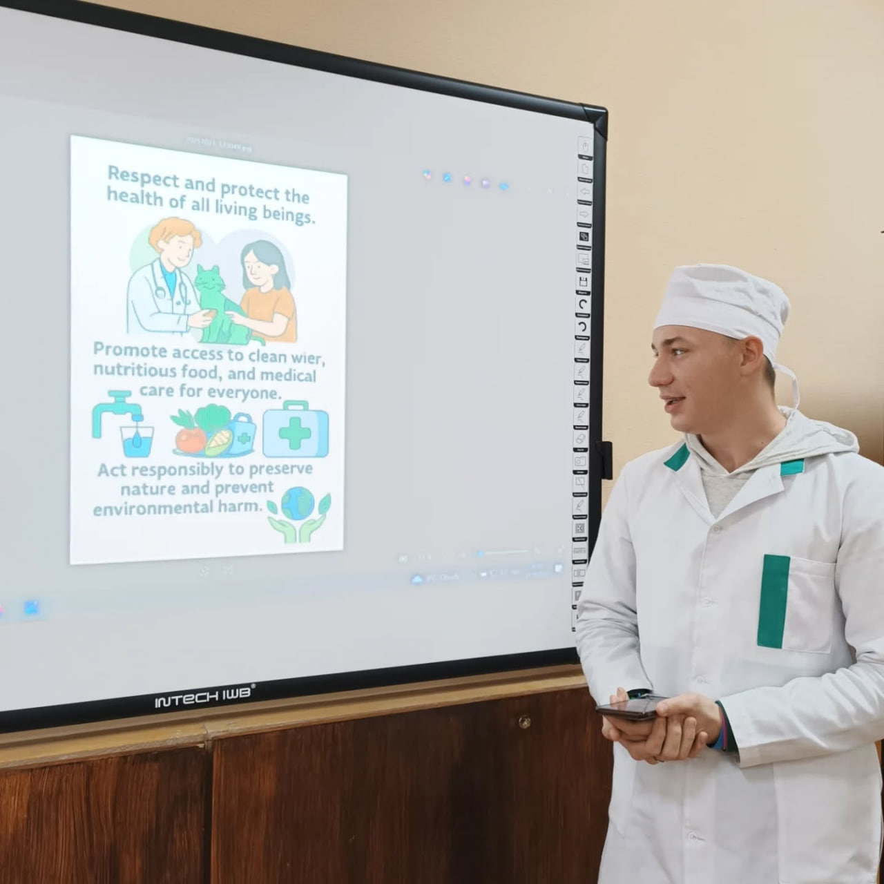 Особое внимание было уделено практической части: участники использовали современные технологии, создавая инфографику с помощью искусственного интеллекта. Визуализации иллюстрировали принципы Декларации, в частности в сфере здоровья и медицины, что помогло соединить философские идеи с цифровыми инструментами.