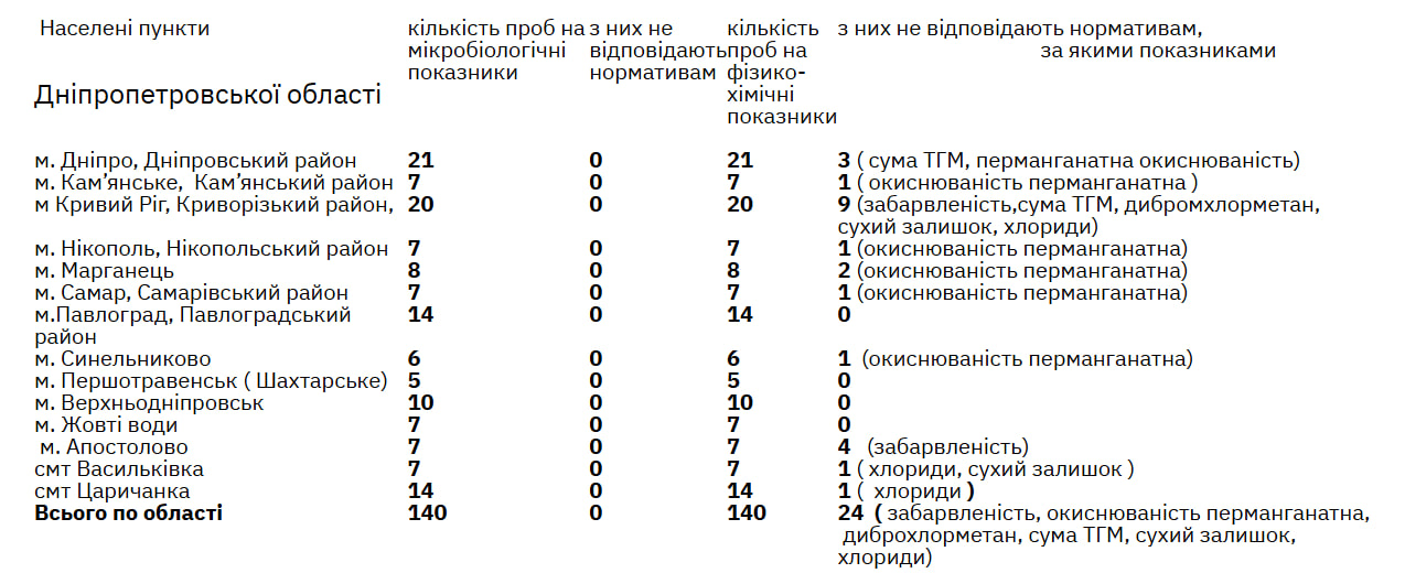 В целом по Днепропетровской области проверено 140 проб по микробиологическим показателям и 140 проб по физико-химическим показателям. Микробиологическое качество воды во всех точках контроля соответствовало нормам, а по физико-химическим показателям отклонения от нормативов выявлены в 24 пробах, в частности по окраске, перманганатной окисляемости, дибромхлорметану, сумме ТГМ, сухому остатку и хлоридам. Показатели остаются на уровне многолетних значений.