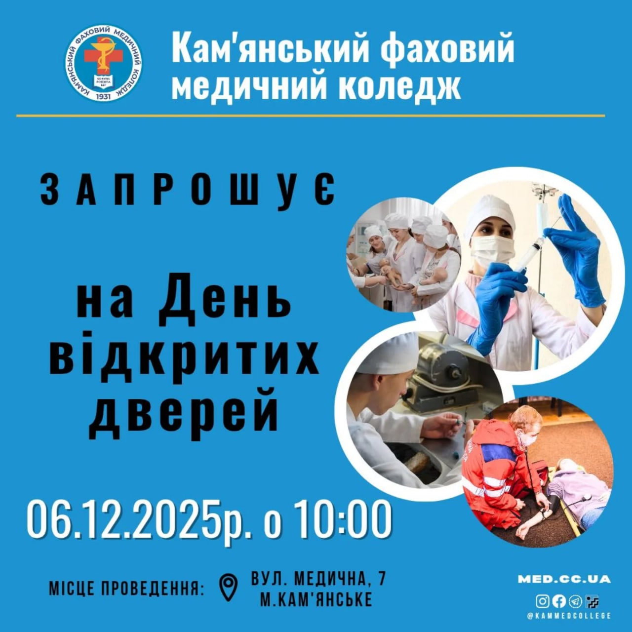 Выпускники школ (9 и 11 классов) и медицинских колледжей приглашаются посетить День открытых дверей в Каменском профессиональном медицинском колледже. Мероприятие состоится 6 декабря 2025 года в 10:00 по адресу: ул. Медицинская, 7, г. Каменское.