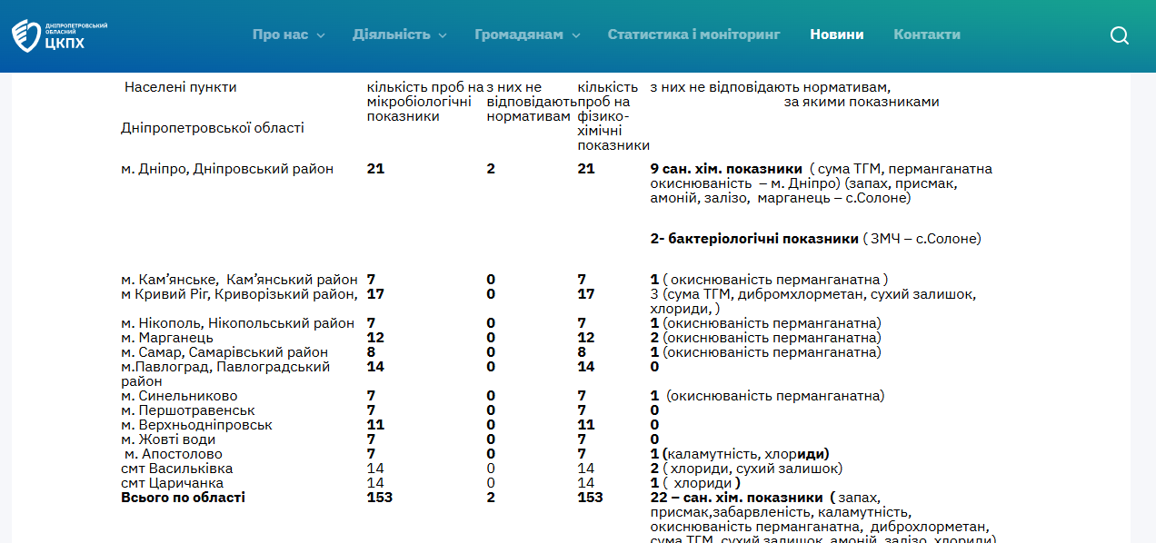 ГУ "Днепропетровский ОЦКПХ МОЗ" подчеркивает, что из-за военного положения и возможности чрезвычайных ситуаций в системах водоснабжения, даже если пробы воды соответствуют нормам, для питьевых нужд следует использовать только кипячёную или дополнительно очищенную воду. Это профилактическая мера для предотвращения инфекционных и неинфекционных заболеваний.
