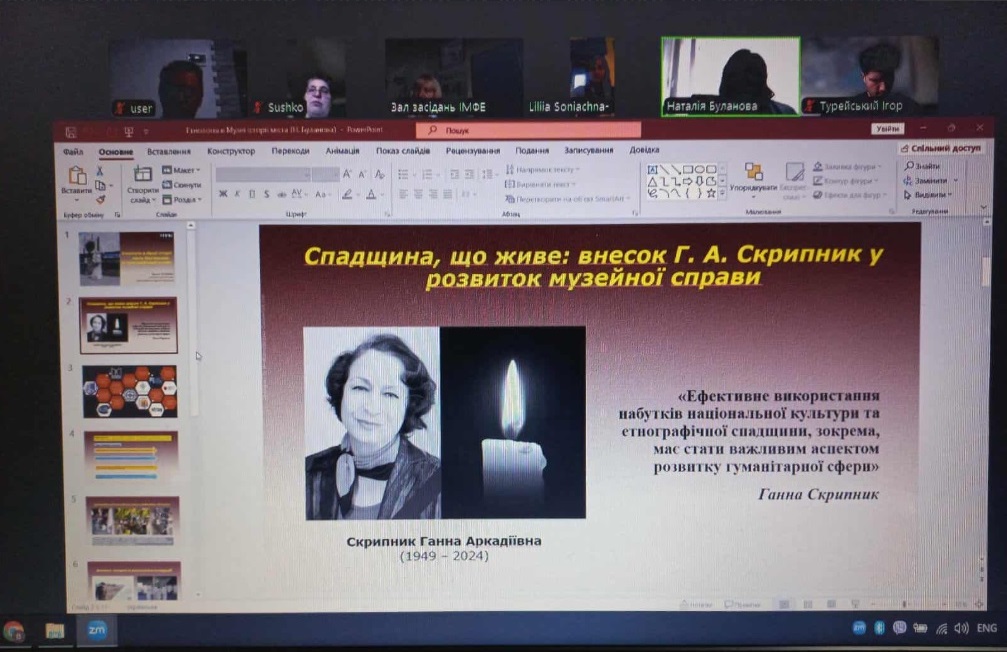 Музей истории города Каменское представил результаты своих этнологических исследований в докладе "Этнология в Музее истории города Каменское: историографический аспект", подготовленном директором учреждения, кандидатом исторических наук Натальей Булановой. В выступлении было подчеркнуто подход Скрыпник к музейной этнологии, которая, по её мнению, должна выходить за рамки простого описания экспонатов и служить источником для глубокого научного анализа. Музей рассматривается как активный инструмент для изучения социальных процессов и культурных трансформаций.
