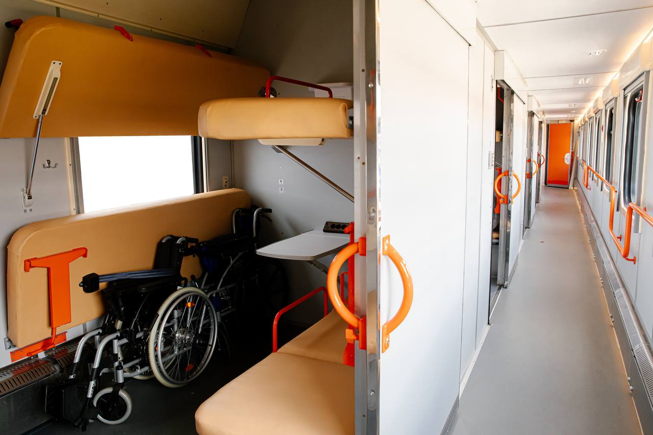 • Четыре увеличенных купе, каждое — для двух пассажиров с инвалидностью и двух сопровождающих.