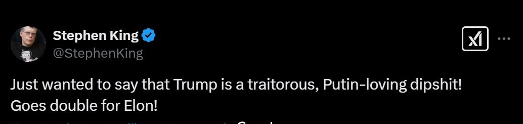 Известный американский писатель Стивен Кинг, который с начала полномасштабного российского вторжения постоянно выражает свою поддержку Украине и критикует ее врагов, написал в социальной сети X (бывший Twitter), что считает новоизбранного президента США Дональда Трампа предателем и путинофилом. Досталось от "короля ужасов", как часто называют Кинга, и владельцу сети X Илону Маску.