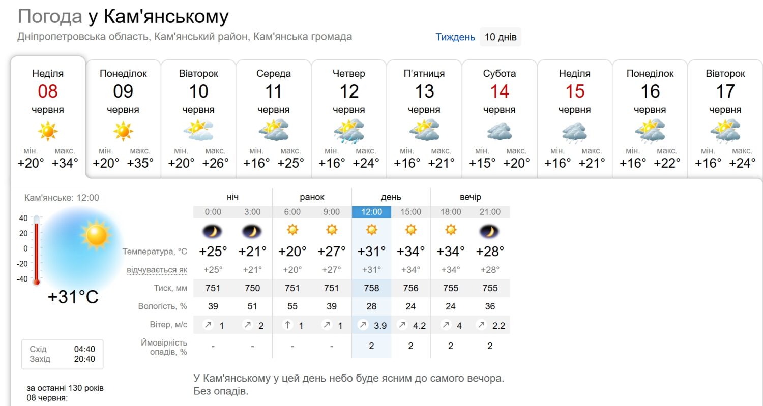 Сегодня, 8 июня, до вечера будет малооблачная погода, без осадков, с умеренным ветром. Температура по области 31-36°, а в Каменском передают до +34°.