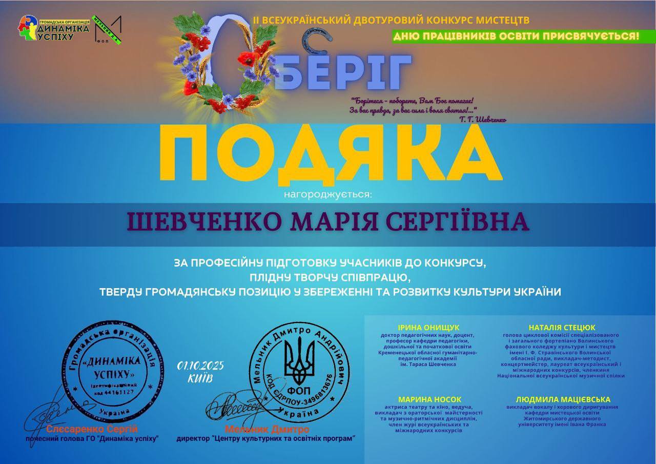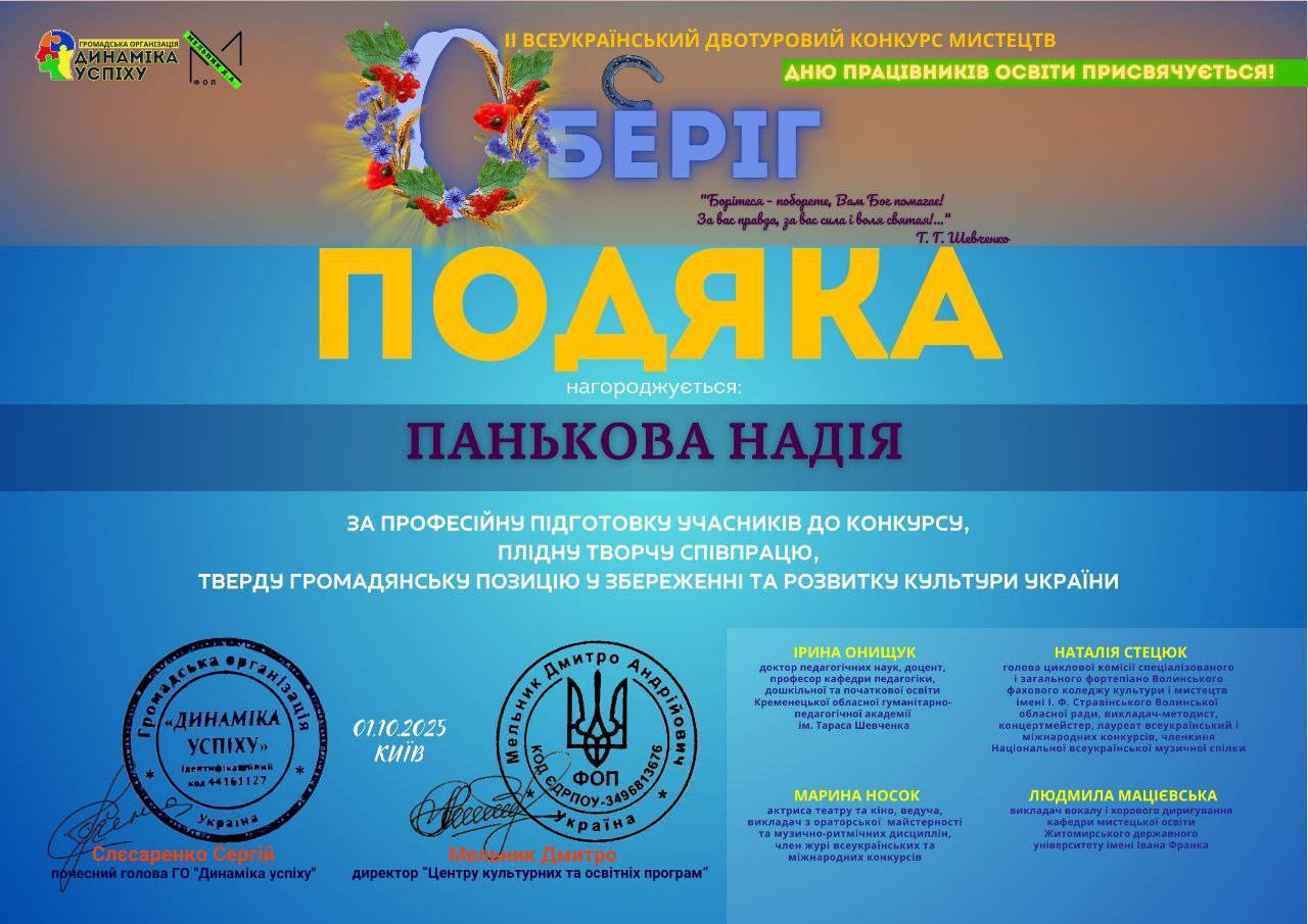 Преподаватель Мария Шевченко и концертмейстер Надежда Панькова получили благодарственные письма от организаторов конкурса за высокий уровень подготовки, профессионализм и вклад в развитие украинской культуры.