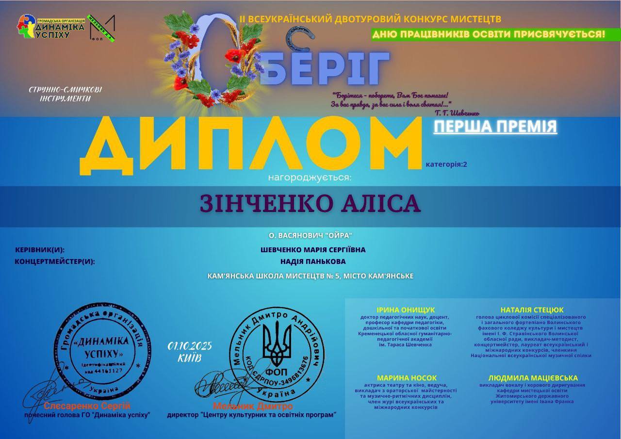 Алиса Зинченко, ученица Каменской школы искусств №5, заняла первое место на II Всеукраинском двухтуровом конкурсе искусств "Оберег", посвящённом Дню работников образования, который состоялся 1 октября в Киеве в номинации "Струнно-смычковые инструменты".