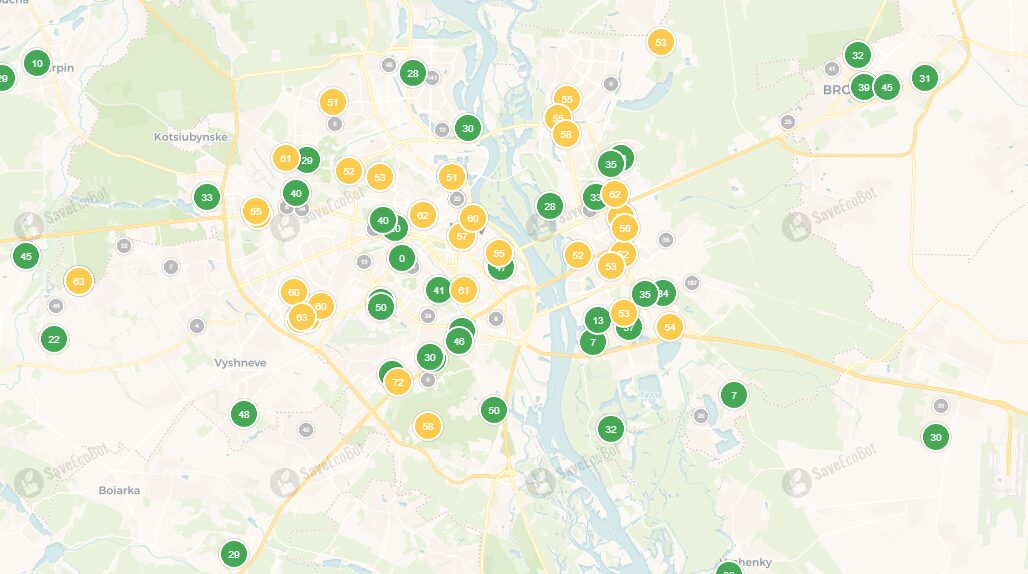 В Киеве схожая ситуация — почти половина столицы находится в желтой зоне. Это означает, что воздух может вызывать дискомфорт у людей с заболеваниями дыхательных путей.