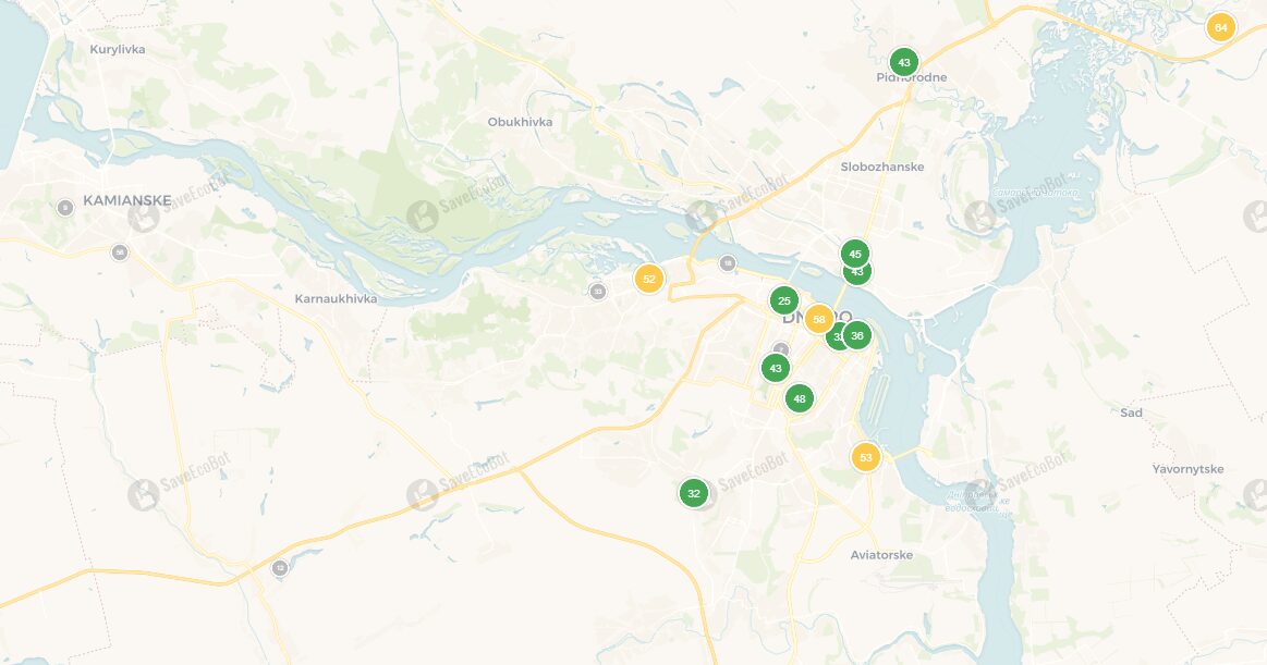 Сегодня, 19 июня 2025 года, по данным сервиса SaveEcoBot, в Каменском воздух чистый — никаких превышений нормы. А вот в Днепре в некоторых районах зафиксировано незначительное превышение, соответствующее желтому уровню. Если у вас повышенная чувствительность, используйте маски.