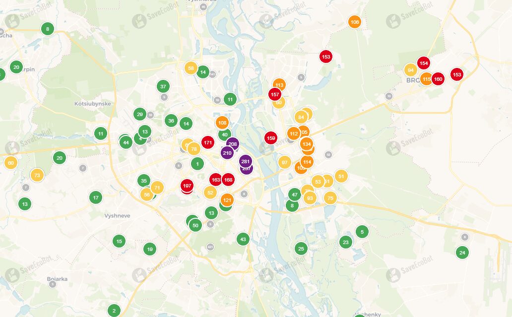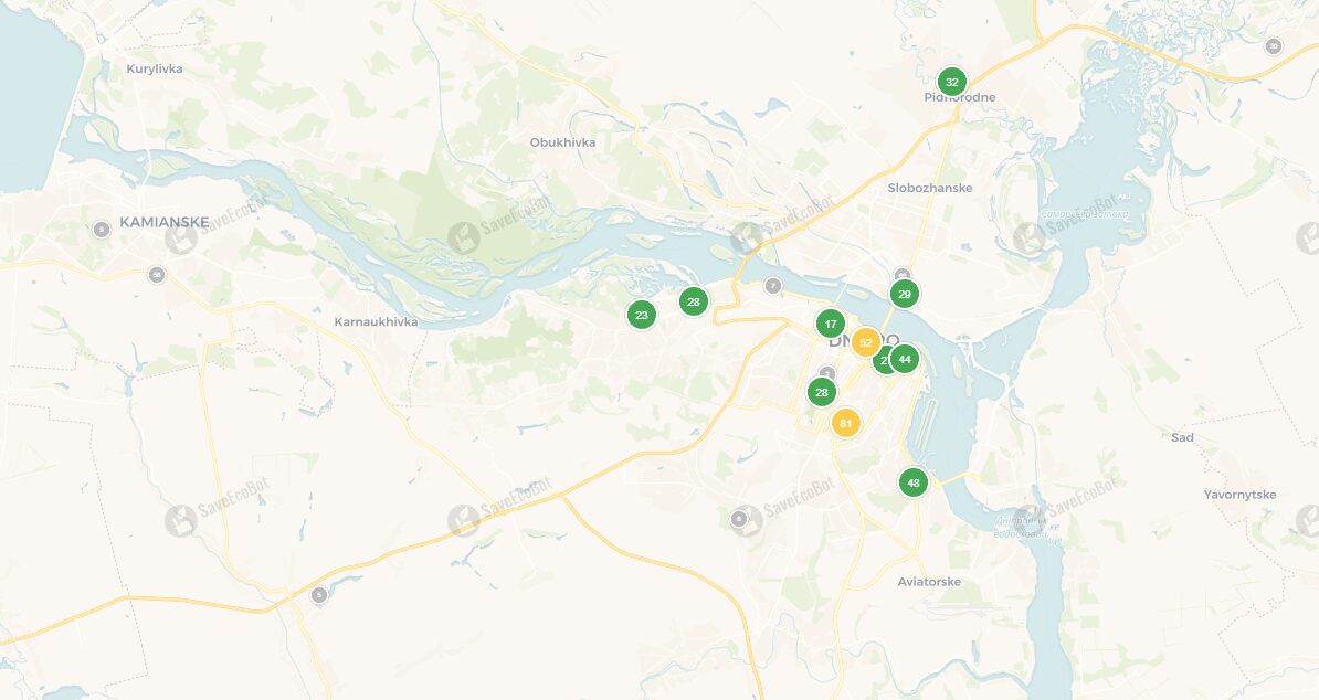 Сегодня, 3 июля 2025 года, по данным сервиса SaveEcoBot, в Каменском — чистый воздух. В Днепре зафиксированы незначительные превышения, но большая часть города находится в зеленой зоне.