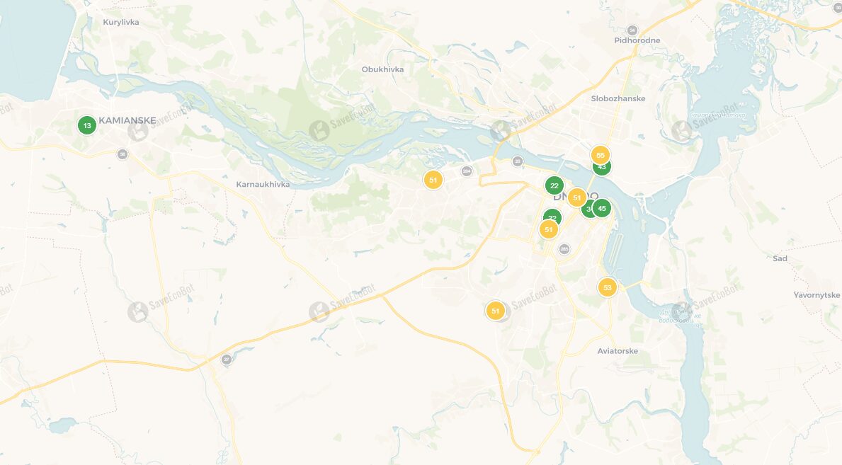 Сегодня, 21 июля 2025 года, по данным сервиса SaveEcoBot, в Каменском — чистый воздух. В Днепре зафиксированы незначительные превышения, угрозы для здоровья нет.
