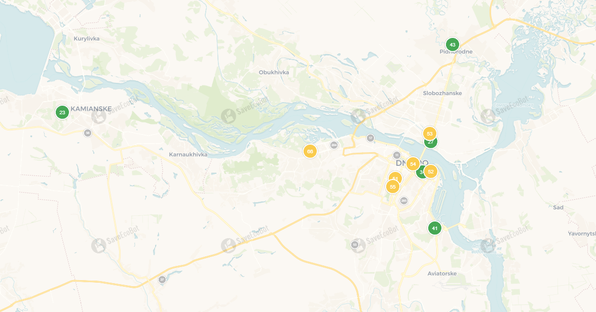 Сегодня, 22 августа 2025 года, по данным сервиса SaveEcoBot, в Каменском чистый воздух. Превышений нет, угрозы для здоровья также нет. В Днепре много превышений желтого уровня. Если у вас повышенная чувствительность, используйте маски или оставайтесь дома.