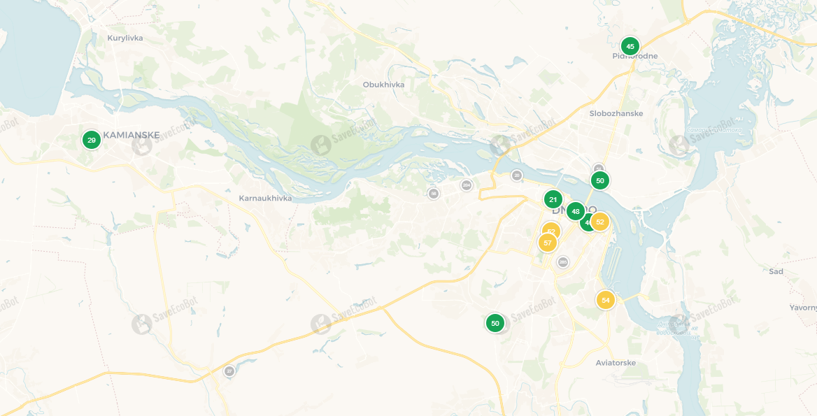 Сегодня, 8 сентября 2025 года, по данным сервиса SaveEcoBot, в Каменском чистый воздух. Никаких превышений, угрозы для здоровья нет. В Днепре зафиксированы небольшие превышения желтого уровня. Если почувствуете дискомфорт во время дыхания, используйте маски.