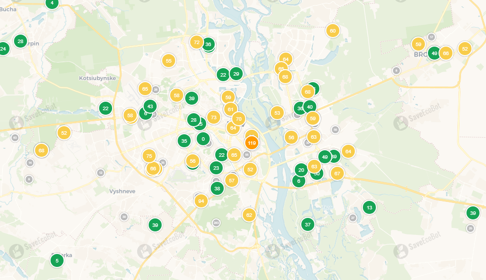 В Киеве очень много превышений желтого уровня. Также в центре столицы датчики показывают оранжевый уровень опасности. Если у вас есть проблемы с дыхательными путями, оставайтесь дома или пользуйтесь защитными респираторами.